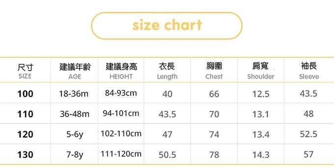 1. 尺寸表單位皆為公分(cm),實際尺寸會因布料彈性、水洗、測量起迄點等因素略有誤差。建議參考孩子平時穿著衣物尺寸進行選購。