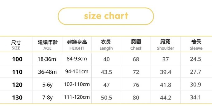 1. 尺寸表單位皆為公分(cm),實際尺寸會因布料彈性、水洗、測量起迄點等因素略有誤差。建議參考孩子平時穿著衣物尺寸進行選購。