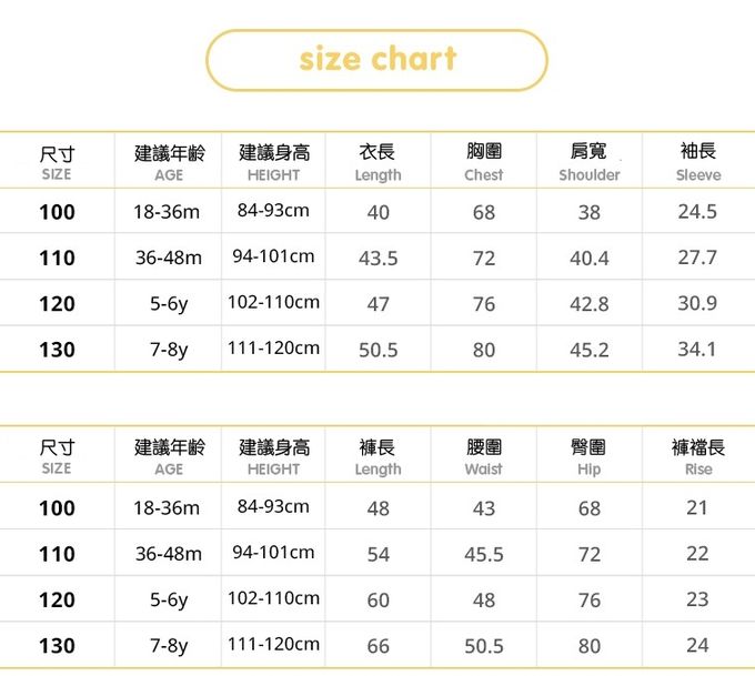 1. 尺寸表單位皆為公分(cm),實際尺寸會因布料彈性、水洗、測量起迄點等因素略有誤差。建議參考孩子平時穿著衣物尺寸進行選購。