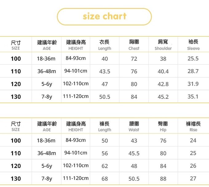1. 尺寸表單位皆為公分(cm),實際尺寸會因布料彈性、水洗、測量起迄點等因素略有誤差。建議參考孩子平時穿著衣物尺寸進行選購。