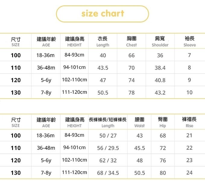 1. 尺寸表單位皆為公分(cm),實際尺寸會因布料彈性、水洗、測量起迄點等因素略有誤差。建議參考孩子平時穿著衣物尺寸進行選購。