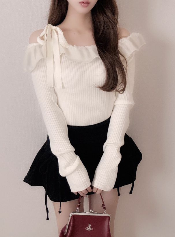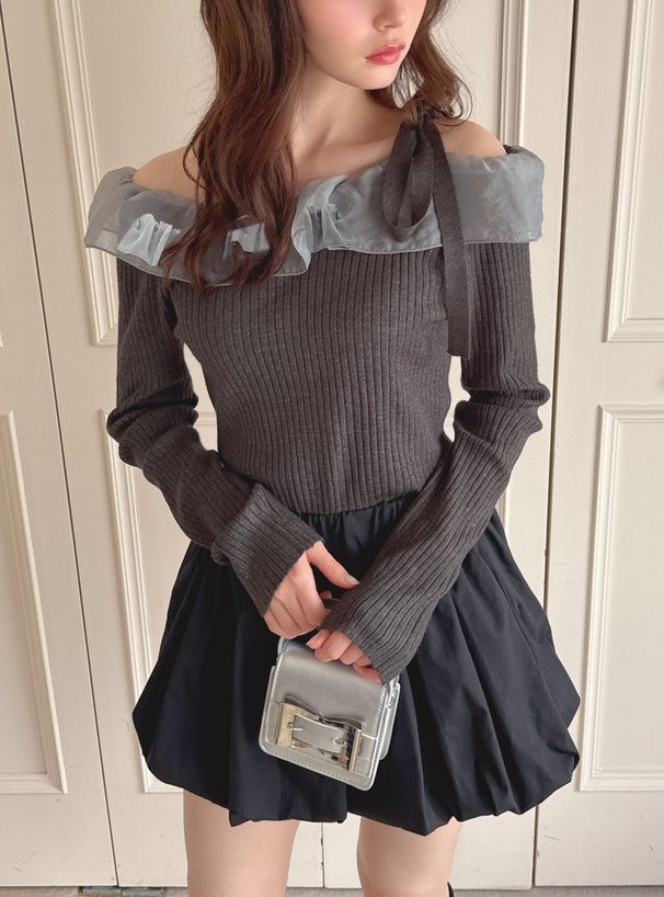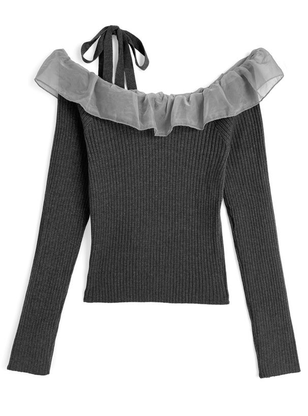 • 品名:歐根紗荷葉露肩領羅紋長袖上衣