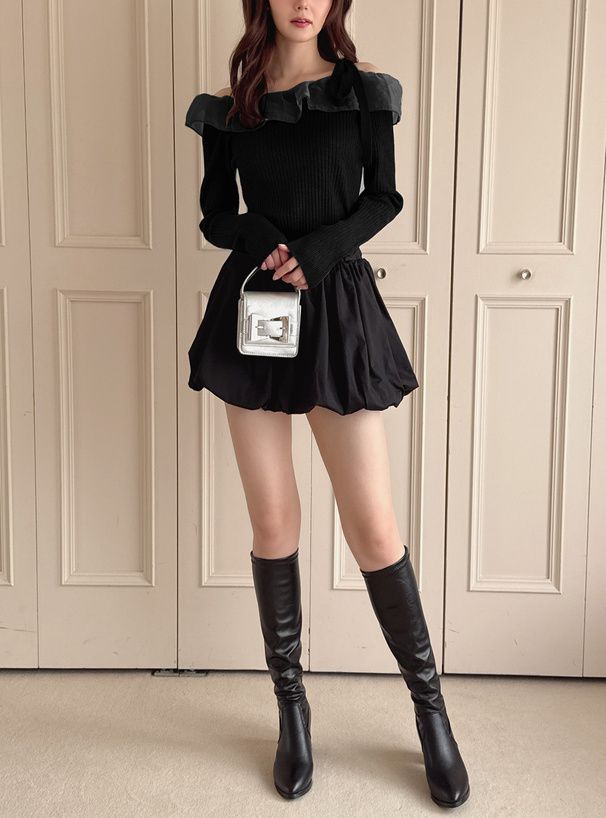 日本 GRL - 歐根紗荷葉露肩領羅紋長袖上衣-黑 (F)