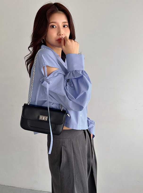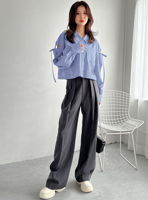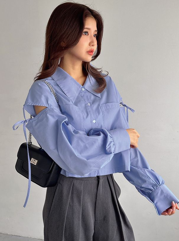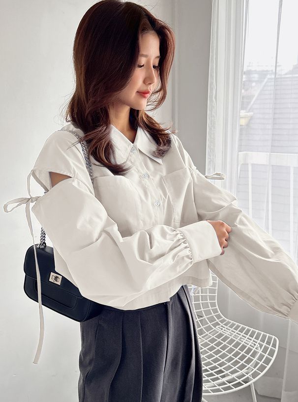 • 品名:露肩開衩個性綁帶短版襯衫
