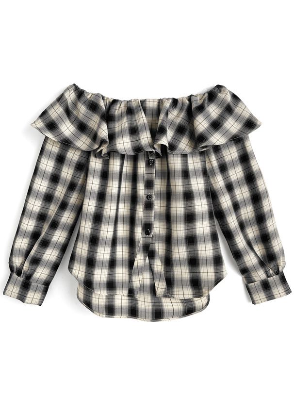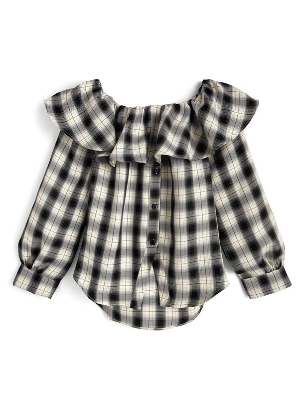 日本 GRL - 俏麗荷葉露肩後綁帶格紋襯衫-黑白 (F)