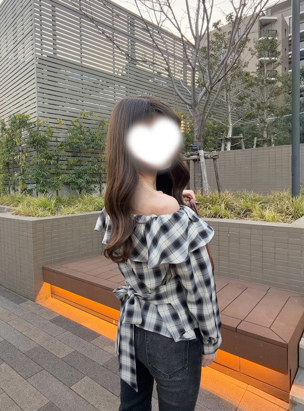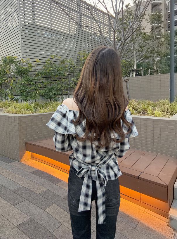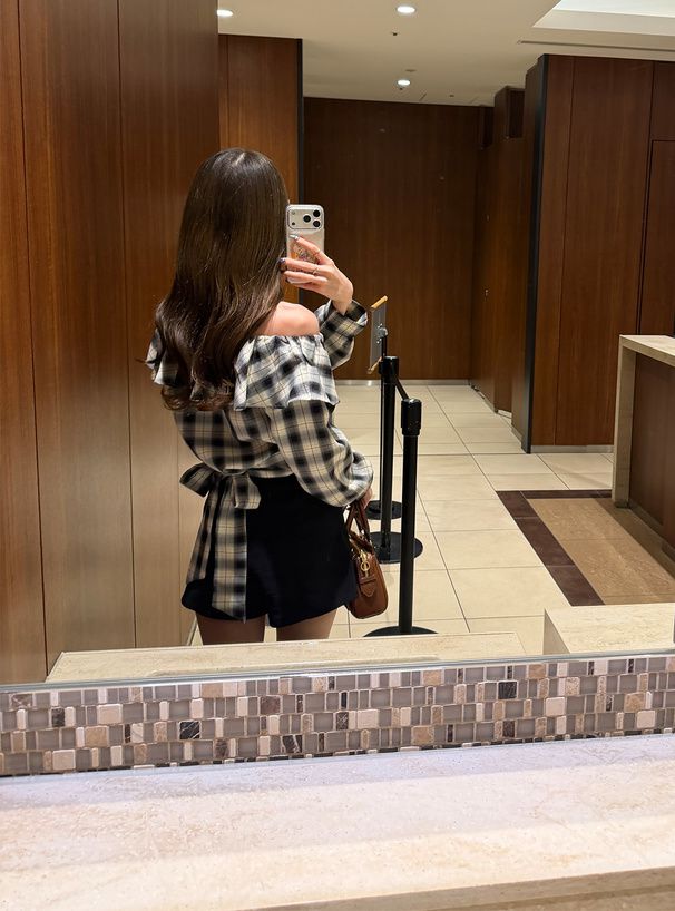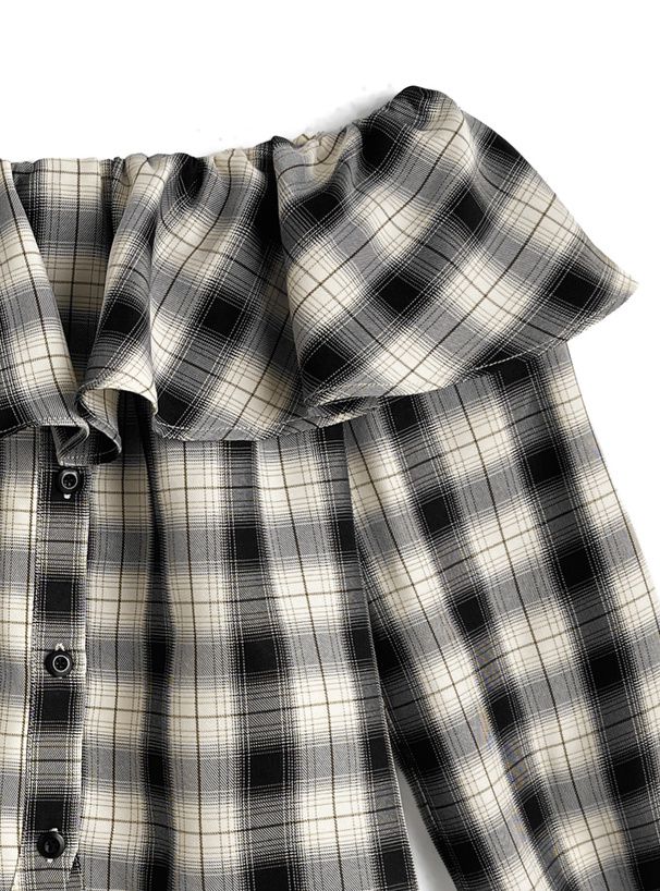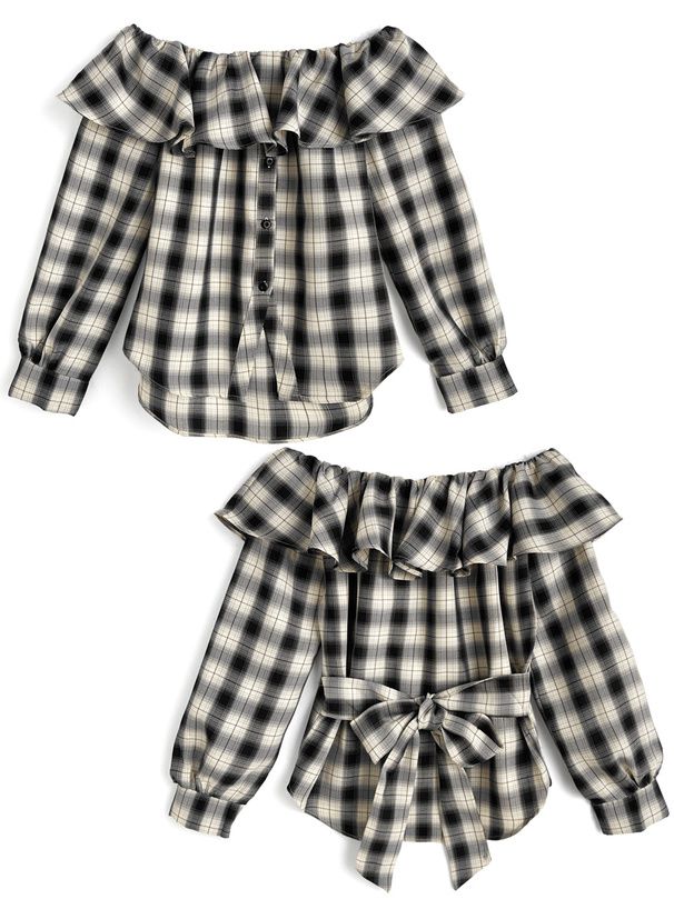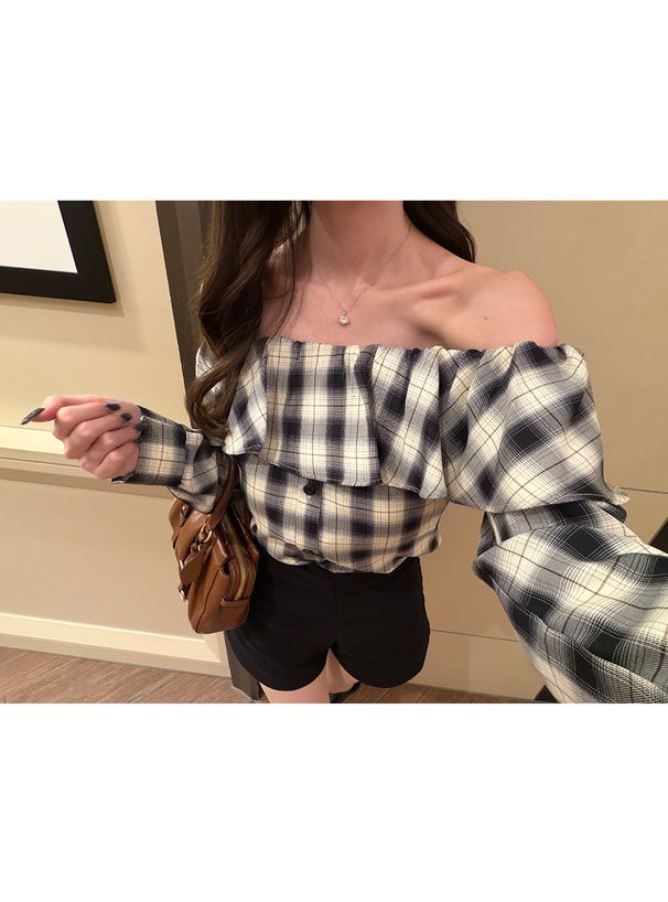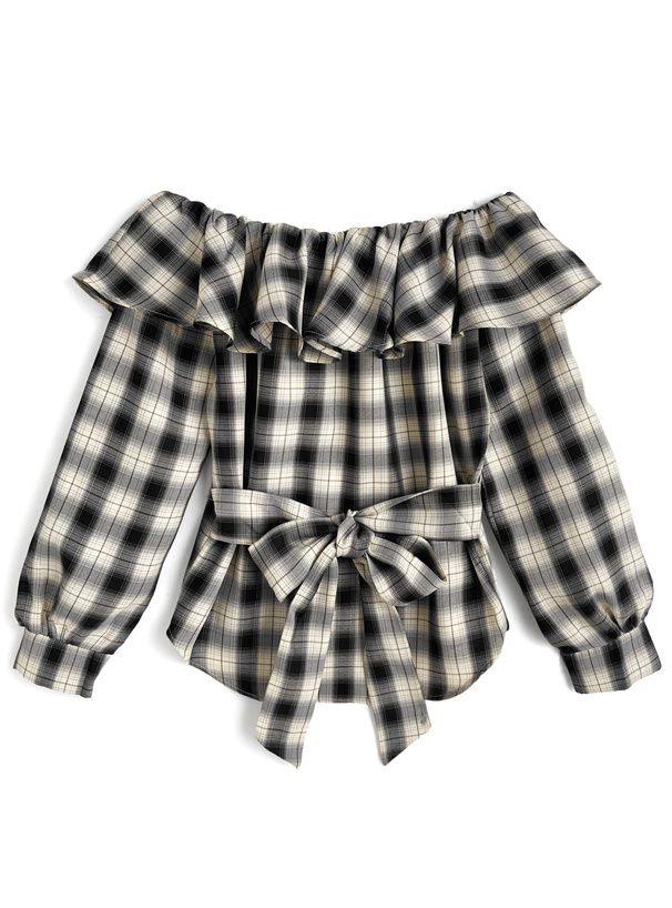 • 品名:俏麗荷葉露肩後綁帶格紋襯衫