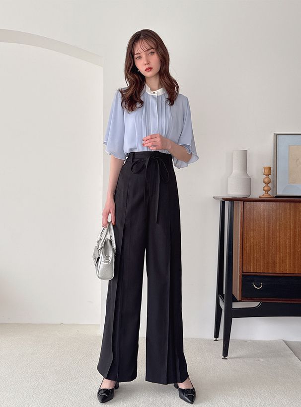 日本 GRL - 甜美皺摺雪紡五分袖襯衫-黑 (F)