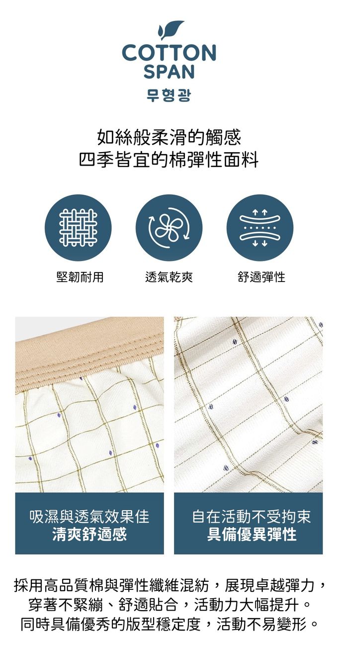 (01.) 採用純棉面料混合彈性纖維,具備良好伸縮性,不緊繃、活動自在,耐用度高,不易變形。