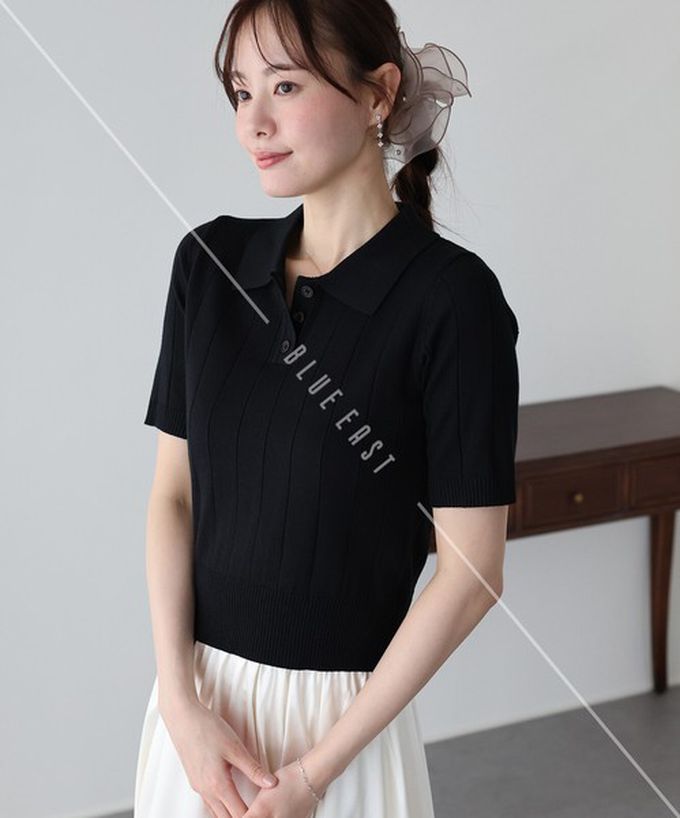 日本 BLUE EAST - 都會氣息寬羅紋針織短袖polo衫-黑