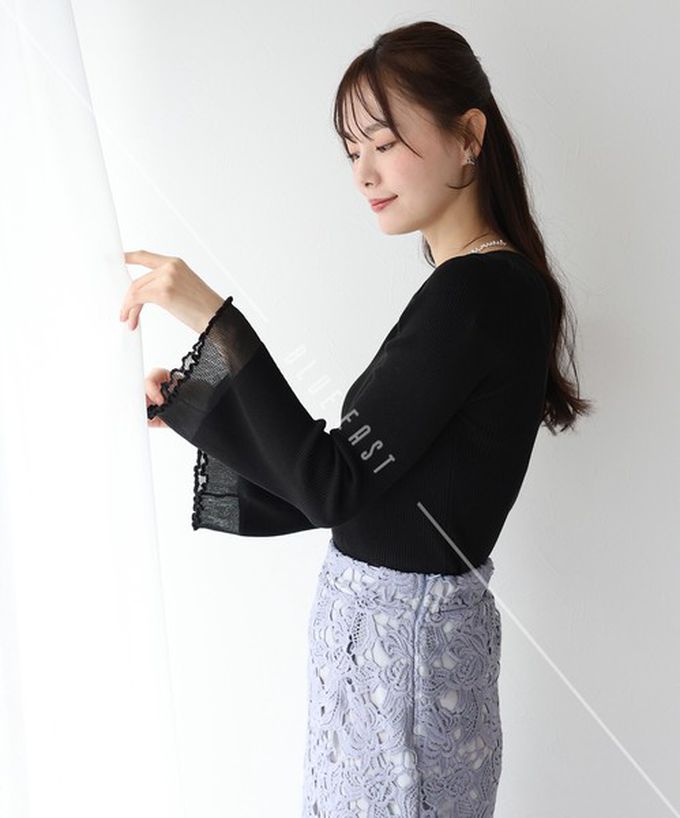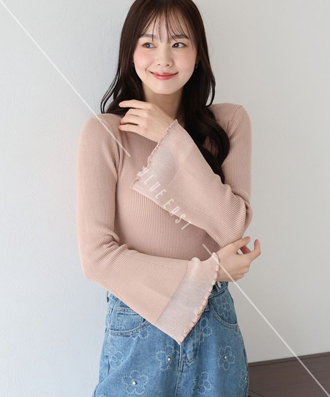 • 品名:修身羅紋透膚層次喇叭長袖上衣