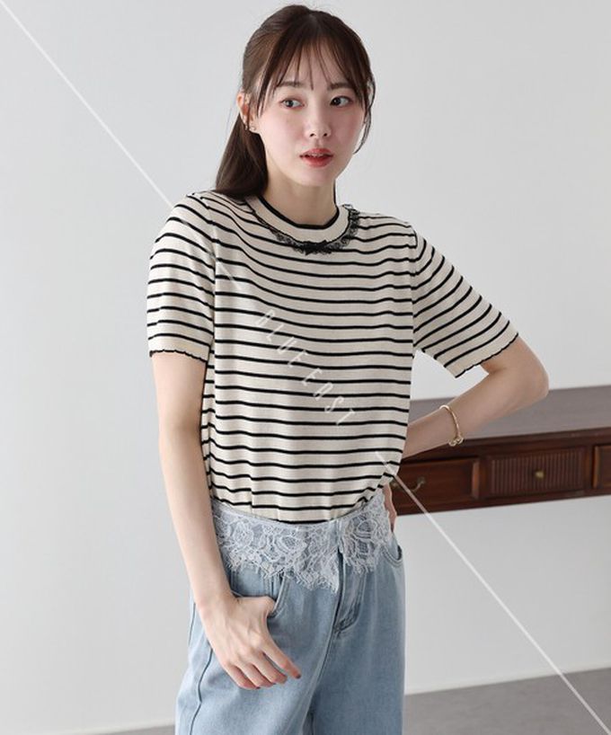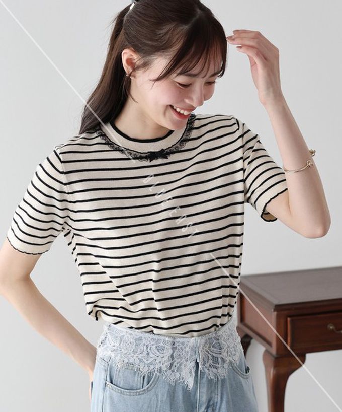 日本 BLUE EAST - 蕾絲蝴蝶結領條紋針織短袖上衣-象牙白