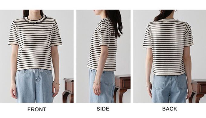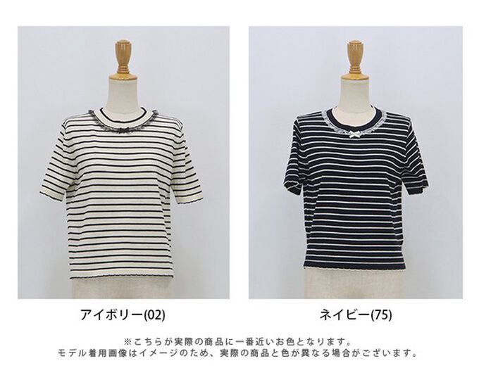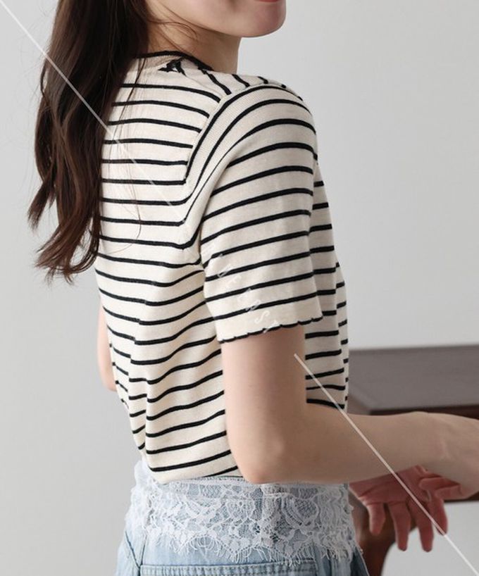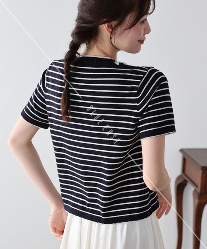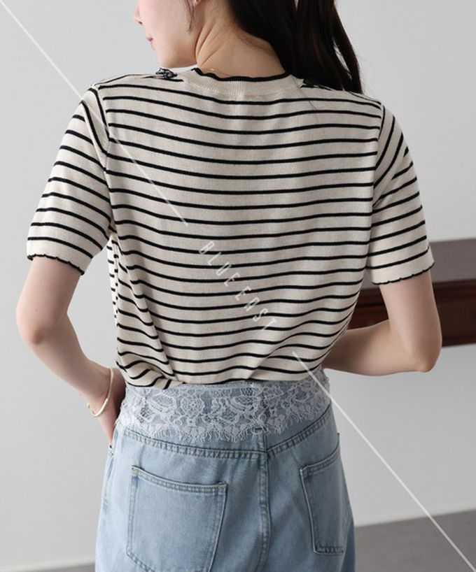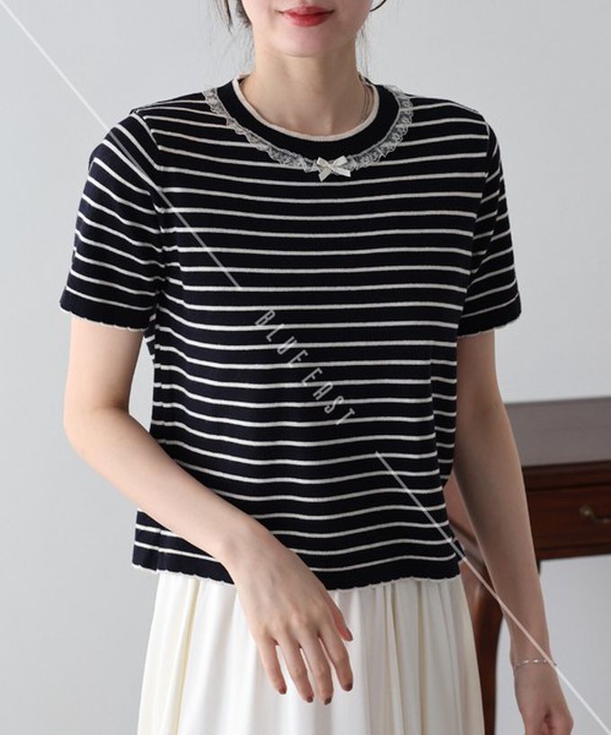 • 品名:蕾絲蝴蝶結領條紋針織短袖上衣