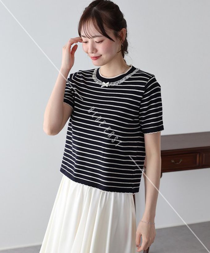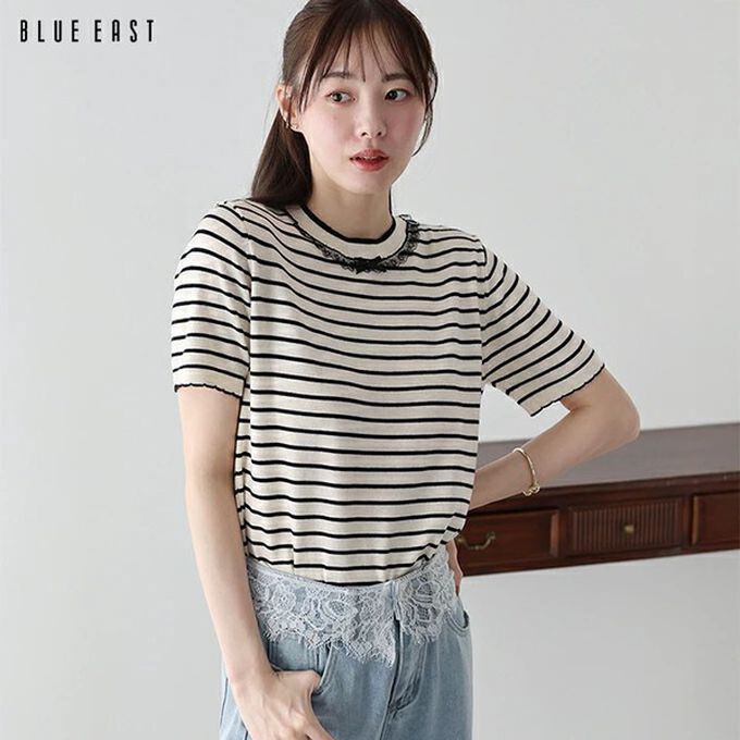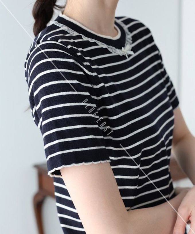 日本 BLUE EAST - 蕾絲蝴蝶結領條紋針織短袖上衣-海軍藍