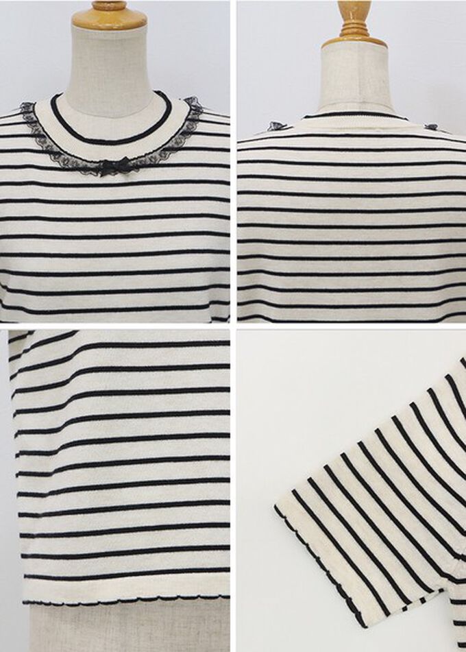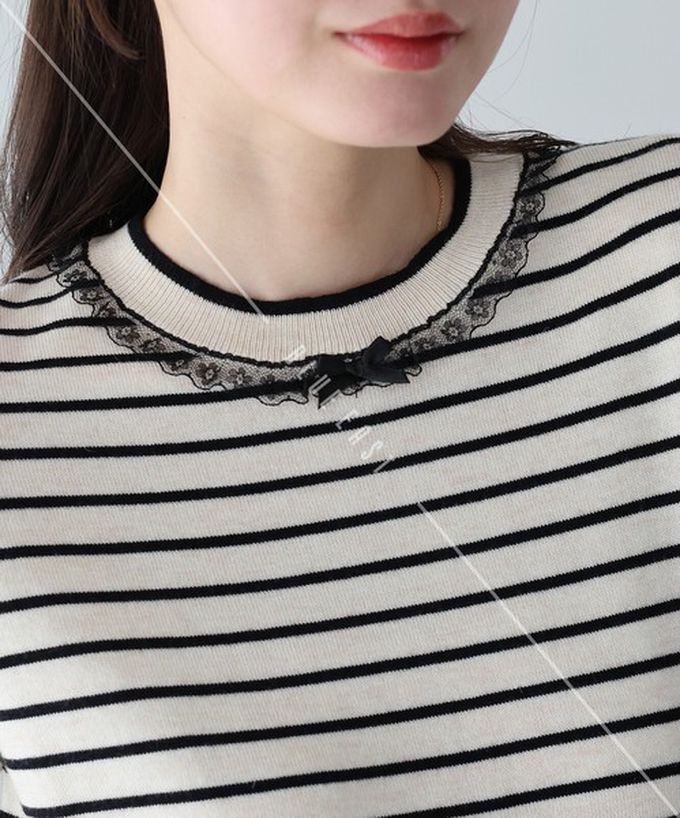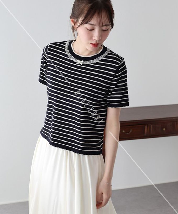 • 品名:蕾絲蝴蝶結領條紋針織短袖上衣