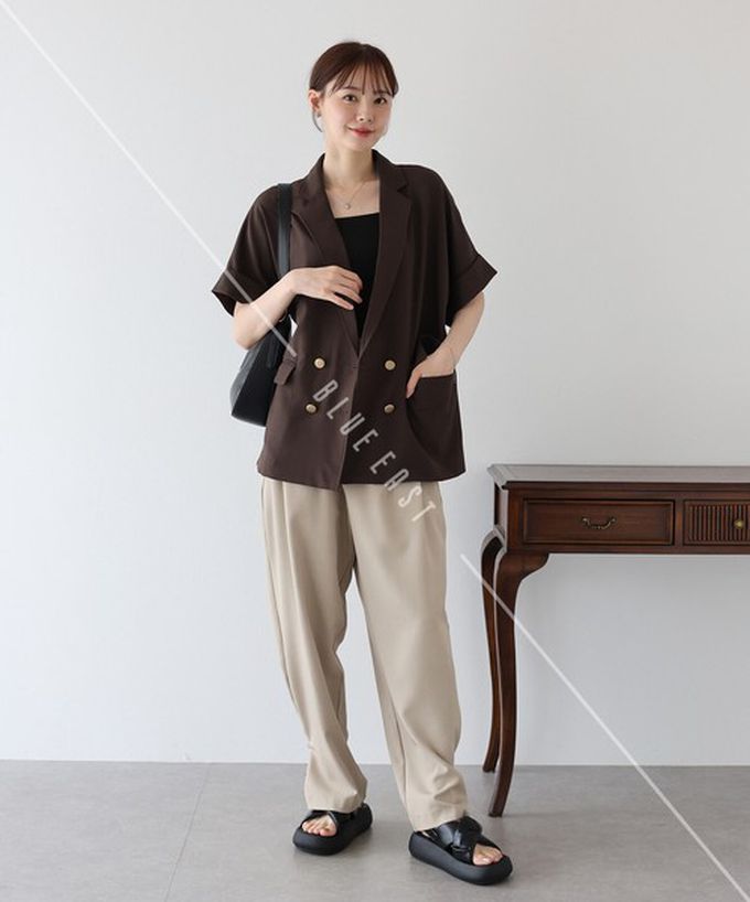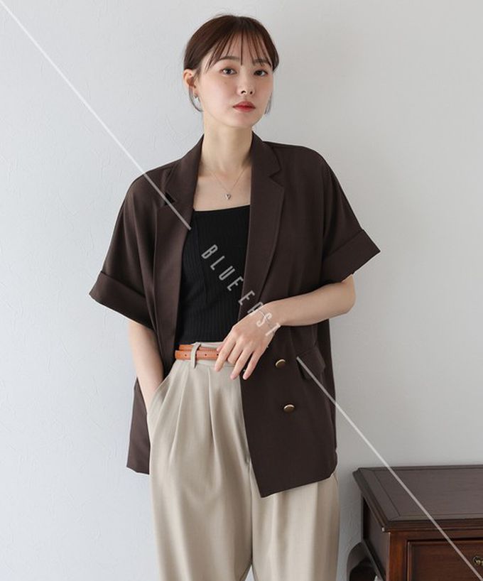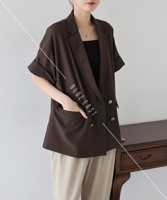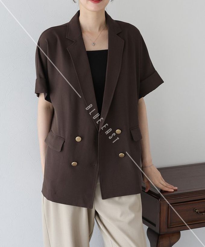 日本 BLUE EAST - 亞麻感氣質金釦短袖西裝外套-咖啡