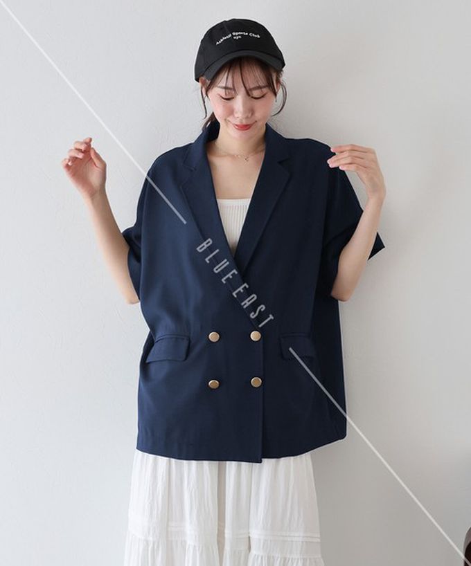 日本 BLUE EAST - 亞麻感氣質金釦短袖西裝外套-海軍藍