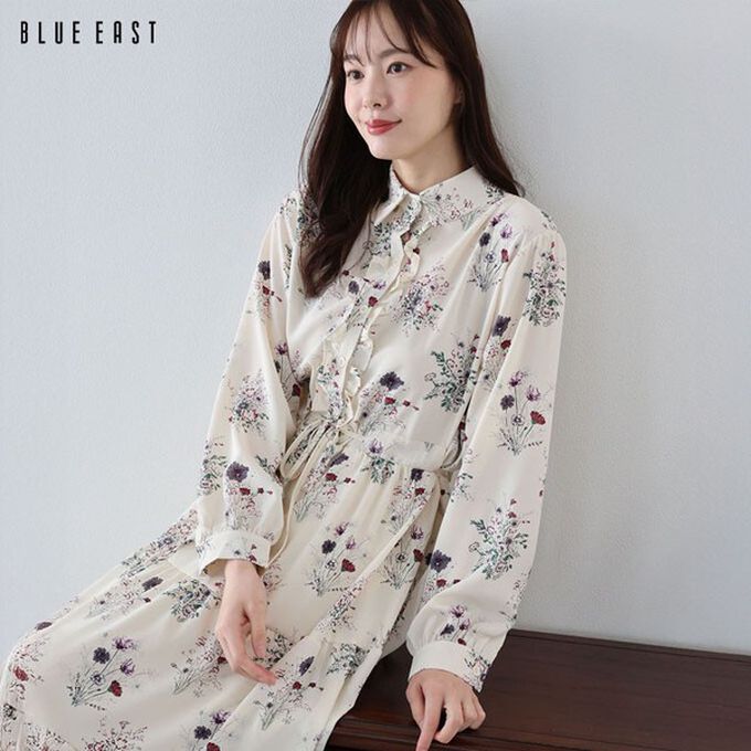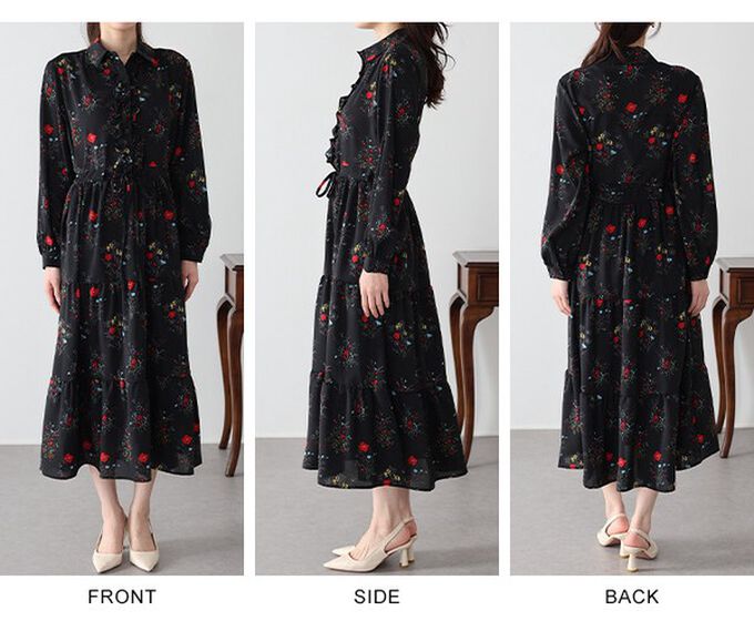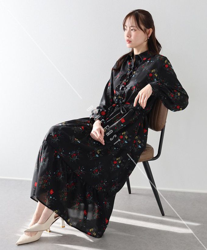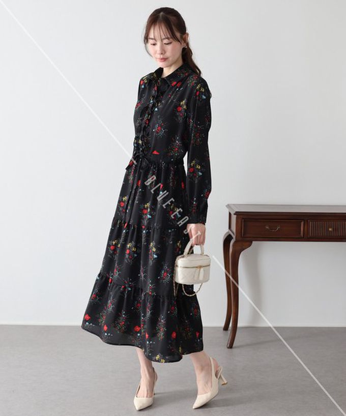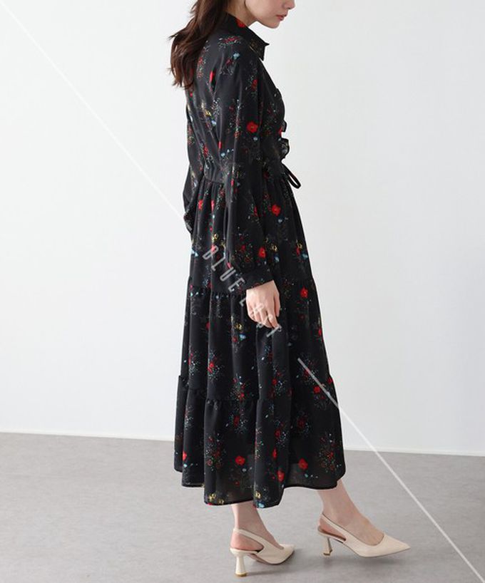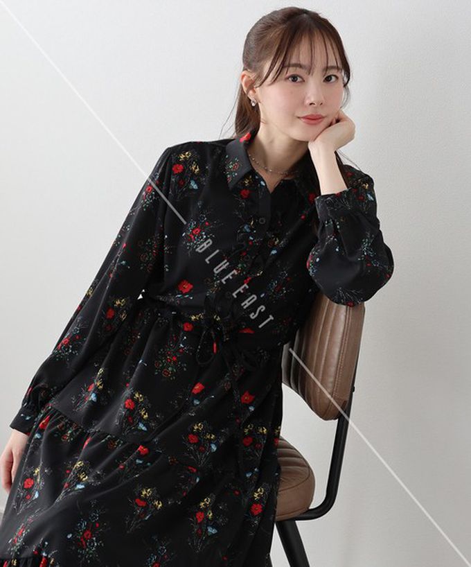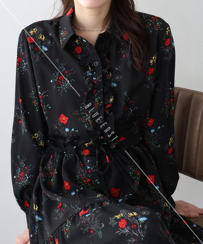 日本 BLUE EAST - 荷葉邊領唯美花卉長袖洋裝(腰抽繩)-黑