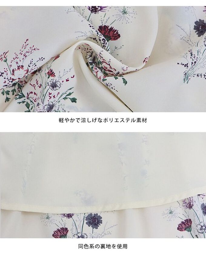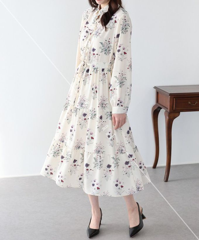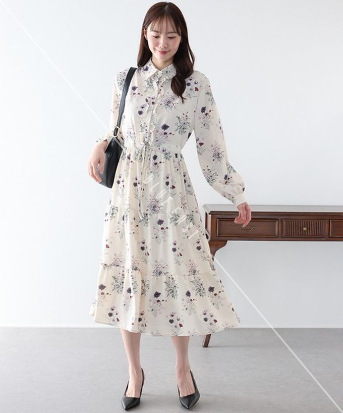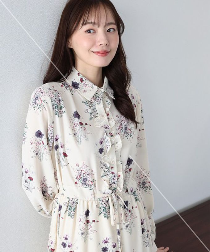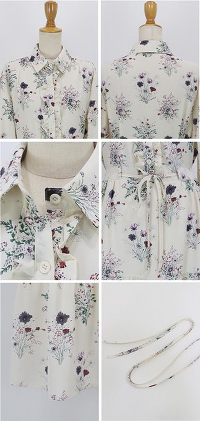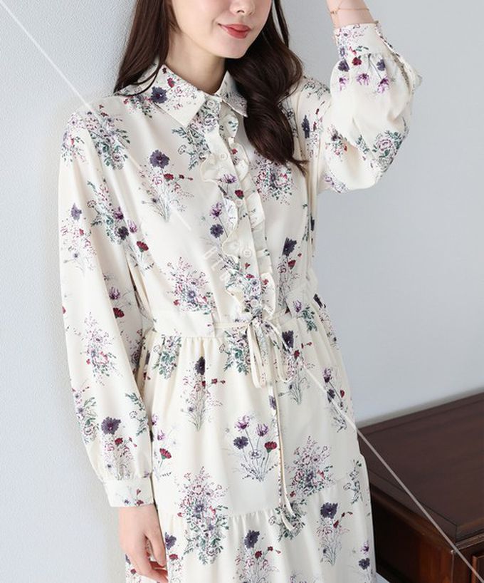 • 品名:荷葉邊領唯美花卉長袖洋裝(腰抽繩)
