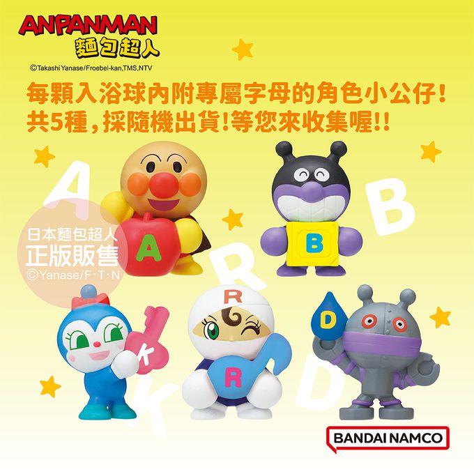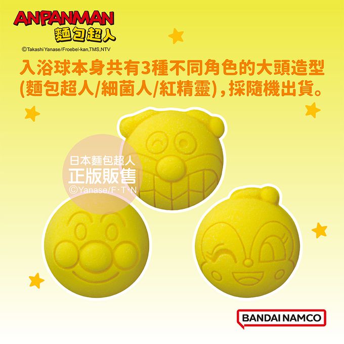 入浴球本身共有3種不同角色的大頭造型(麵包超人/細菌人/紅精靈),採隨機出貨。