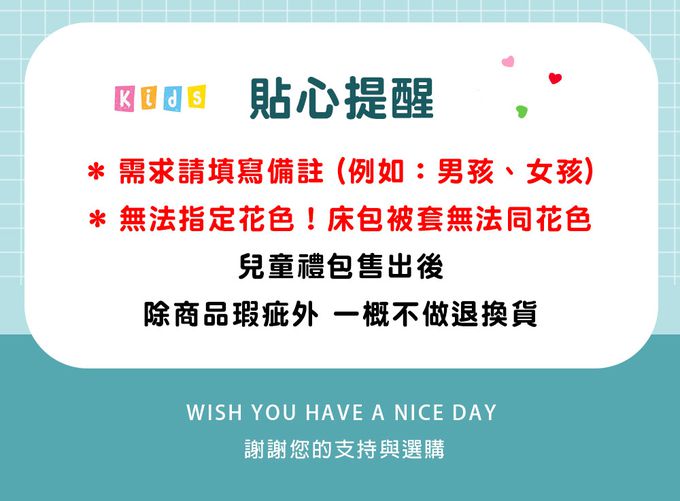 兒童禮包售出後除商品瑕疵外一概不做退換貨