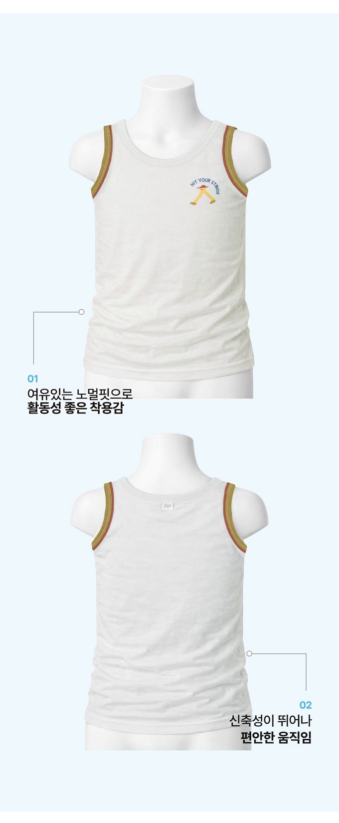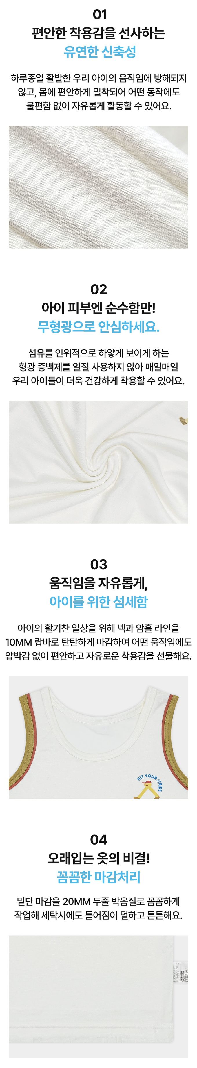 (01.)  柔軟有彈性,穿著舒適,緊貼身形但不緊繃,全天活動也不受限制,孩子可以自由自在地動來動去。