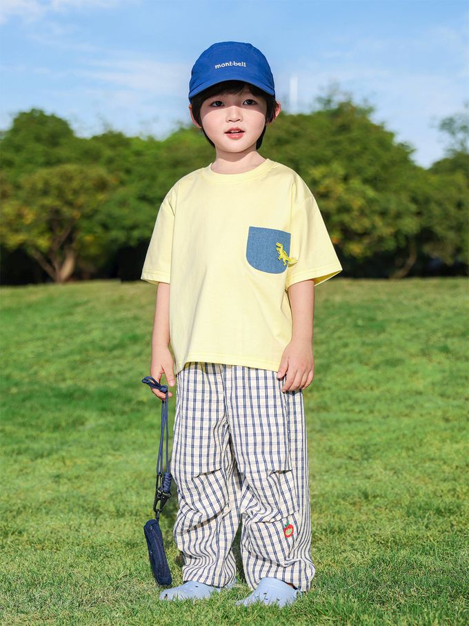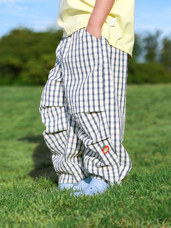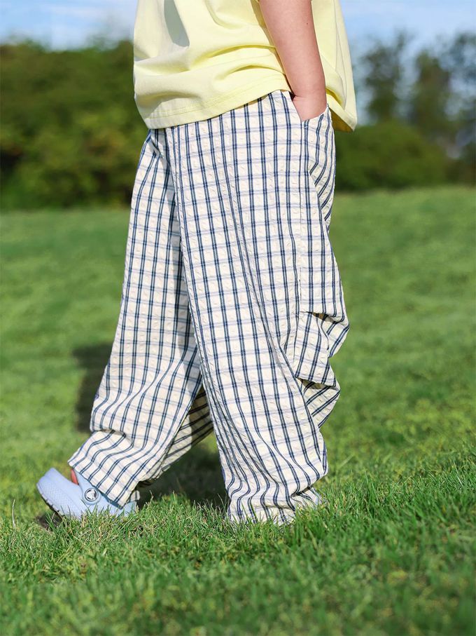 輕薄泡泡格壓褶防蚊褲-萌趣鱷魚-藍x白
