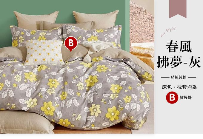 台灣製 極致純棉寢具組-春風拂夢-灰 (B版)-雙人三件式床包組