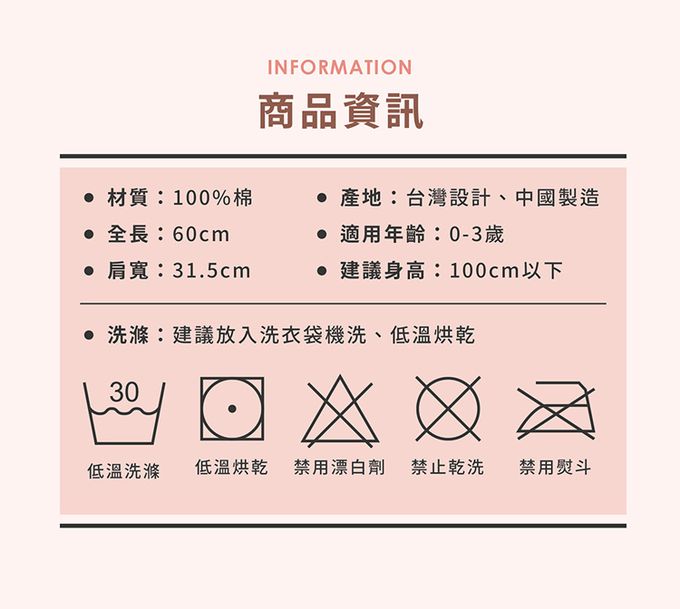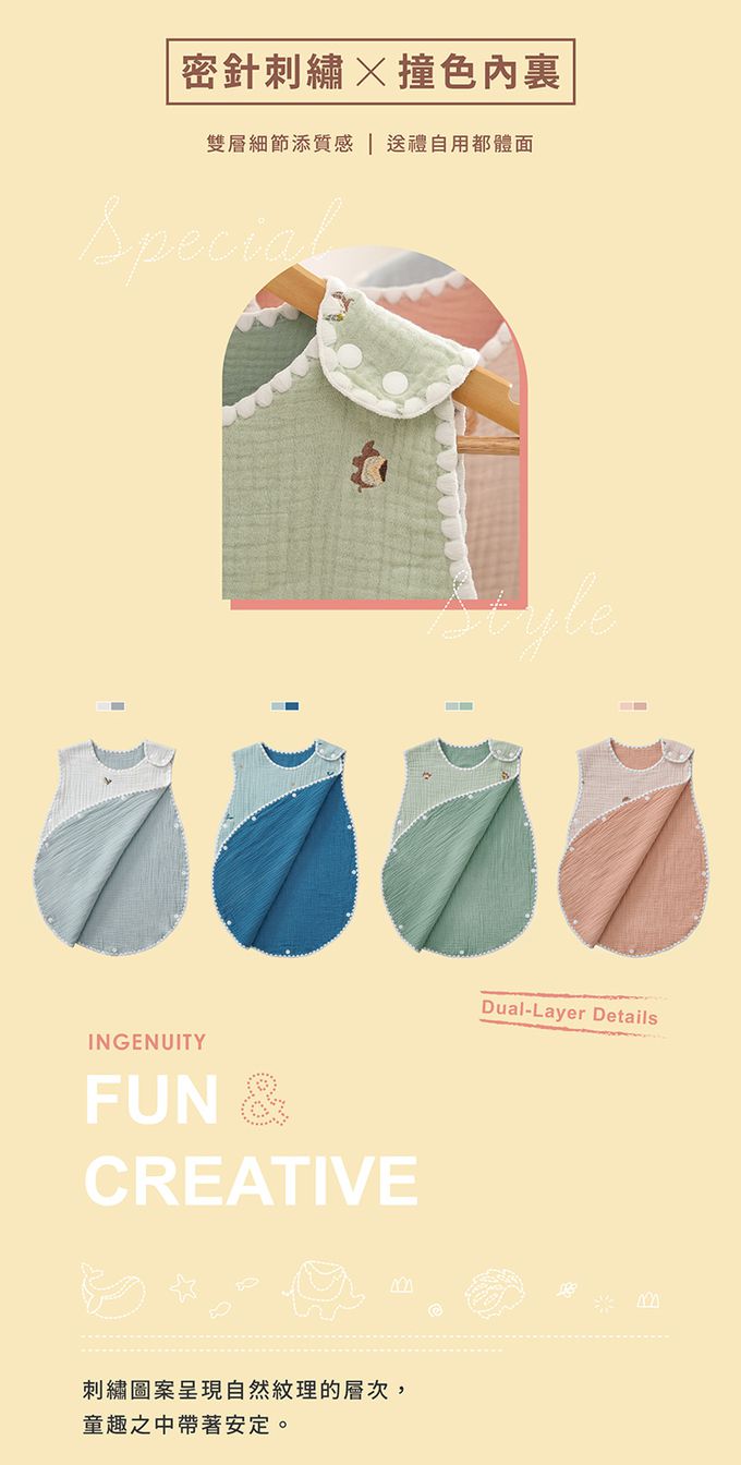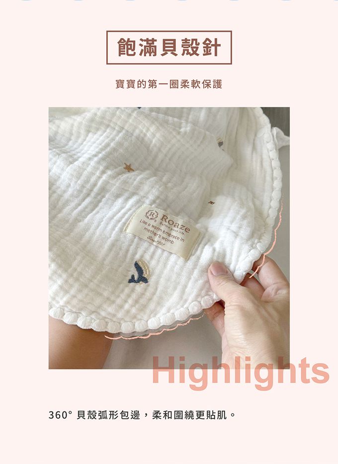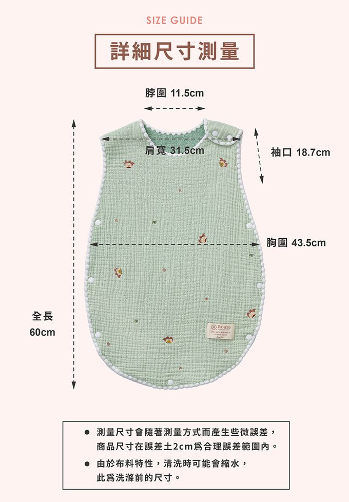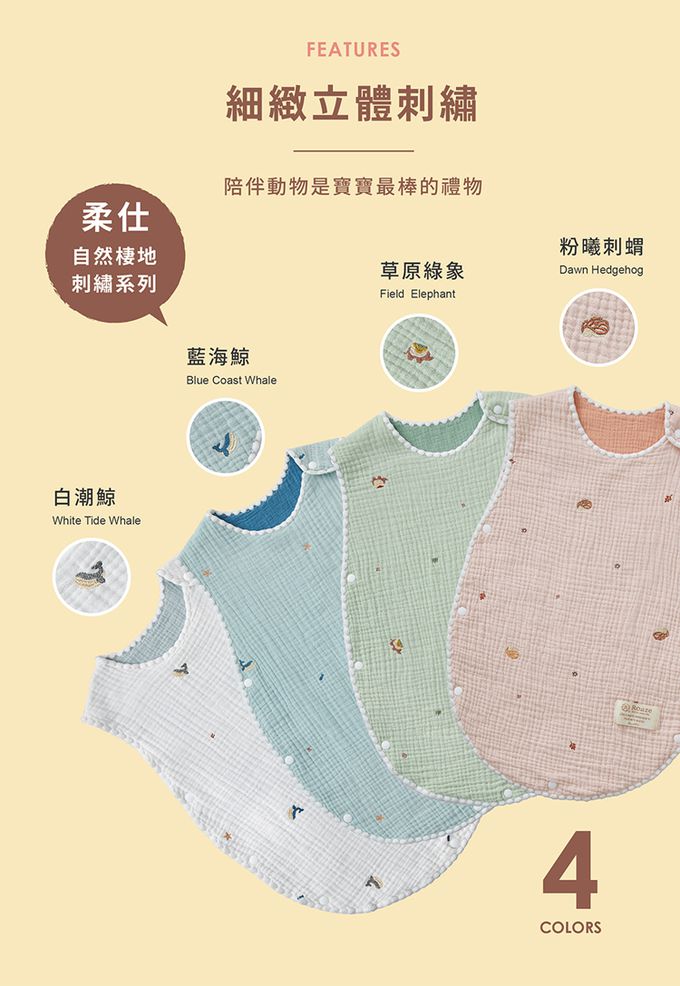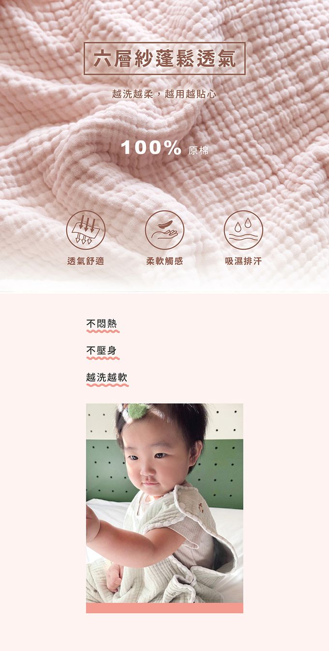 ★貝殼針設計,輕柔包覆、柔軟親膚★密針立體刺繡,精緻圖案增添童趣★六層紗蓬鬆透氣,越洗越柔、越用越貼心★四季皆可使用,空調房恆溫必備,對抗季節轉換★100%天然棉紗,新生兒、敏弱肌適用・建議身高:100cm以下ㆍ適用年齢: 0-3歳・尺寸: 全長60cm、肩寬31.5cm、胸寬43.5cm・材質: 100%棉 ・・產地:台灣設計、中國製造ㆍ洗滌: 建議放入洗衣袋機洗、低溫烘乾