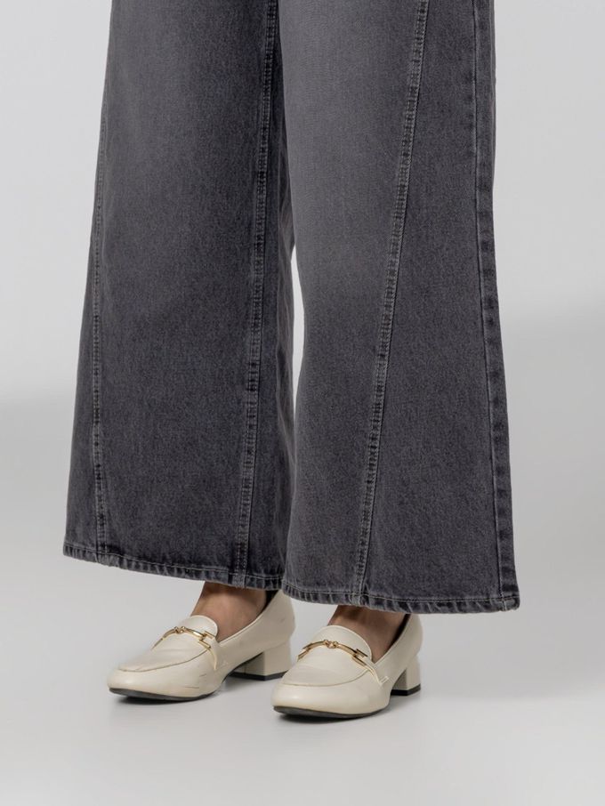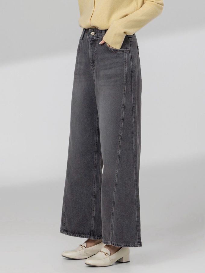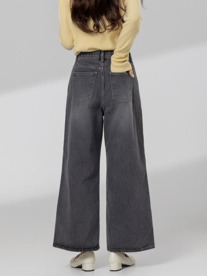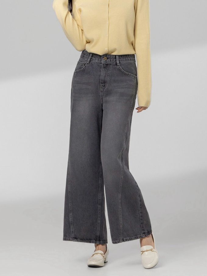 韓國女裝連線 - EDITION 彈性腰立體剪裁設計丹寧寬褲-黑灰