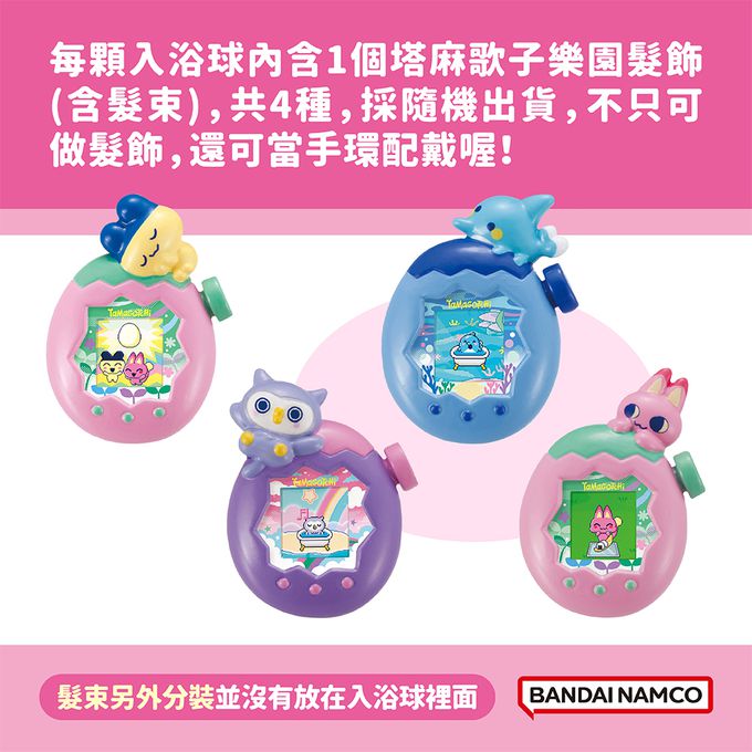 每顆入浴球內含1個塔麻歌子樂園髮飾(含髮束),共4種,採隨機出貨,將入浴球放入水中,等溶化後髮飾就會浮出水面!
