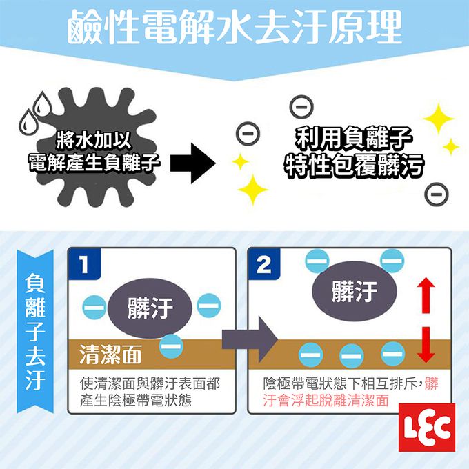 1. 將水加以電解產生負離子,負離子會使清潔面與髒污表面都產生陰極帶電狀態。