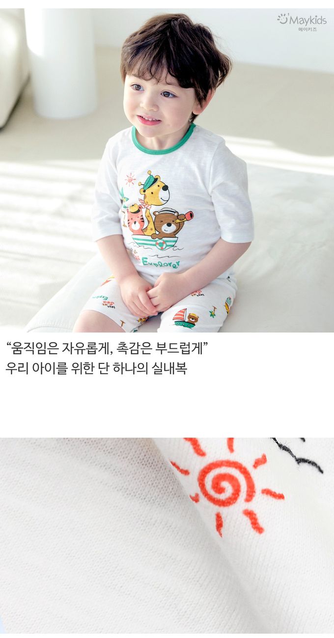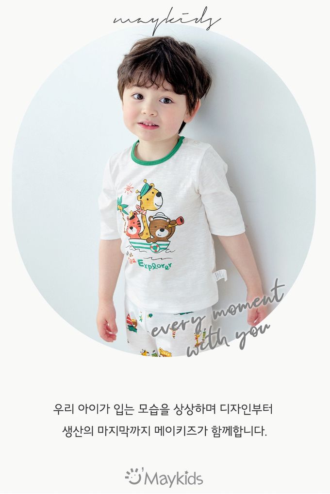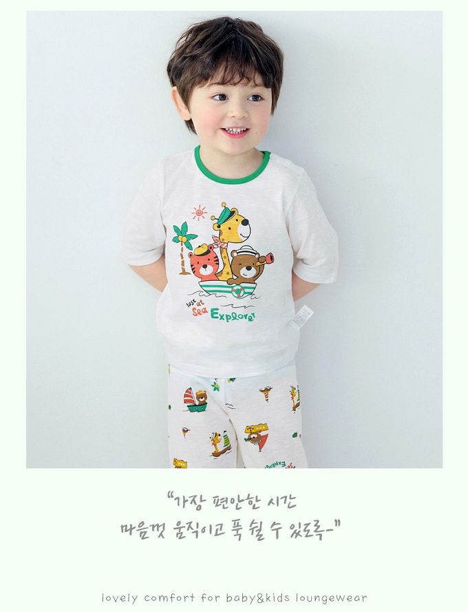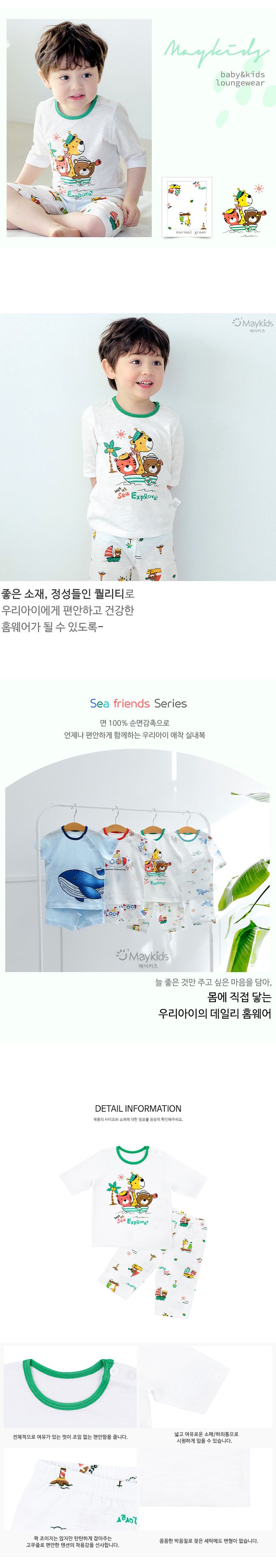 韓國 Maykids - 輕薄細柔棉七分袖家居服-海上探險動物-白X綠