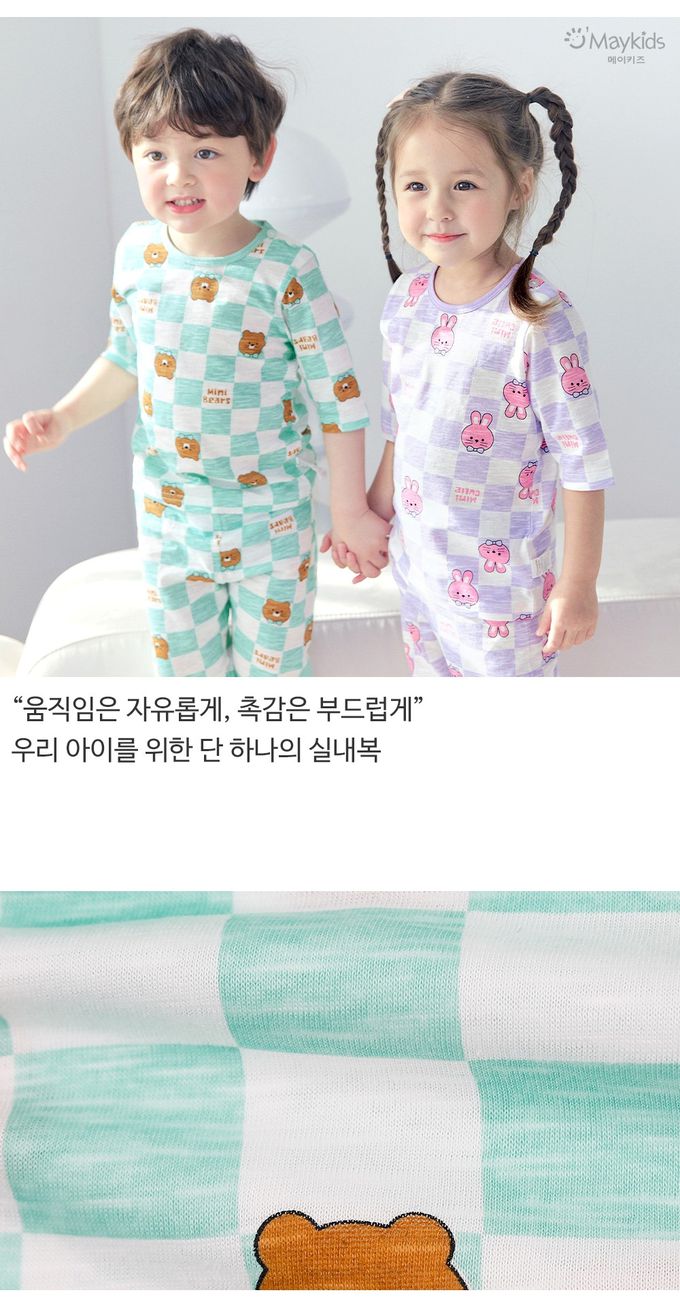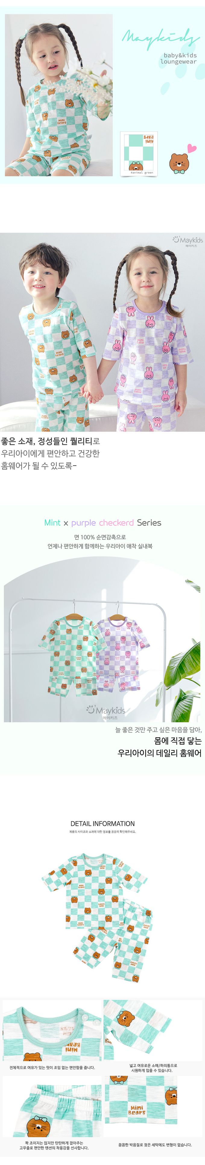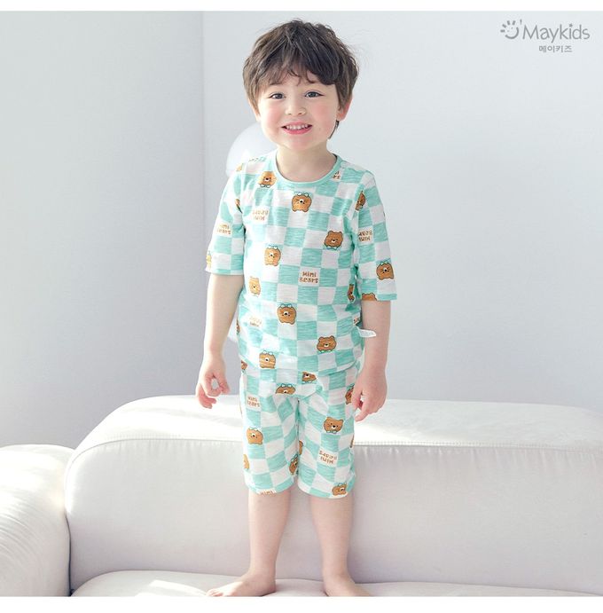 韓國 Maykids - 輕薄細柔棉七分袖家居服-棋盤格熊熊-薄荷綠