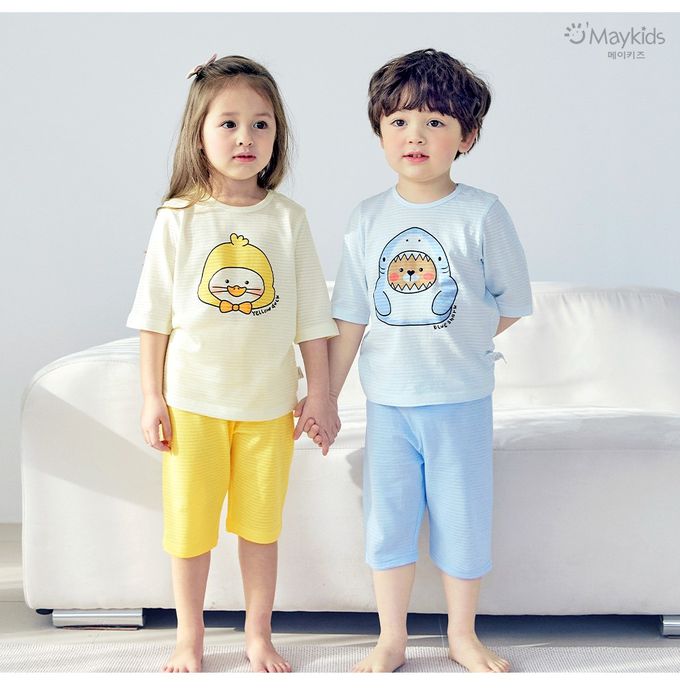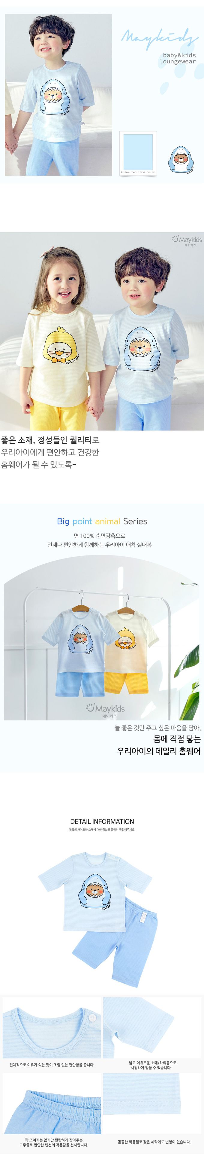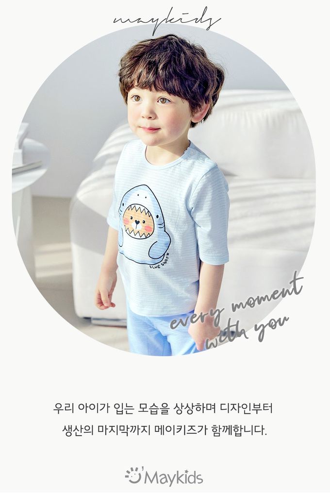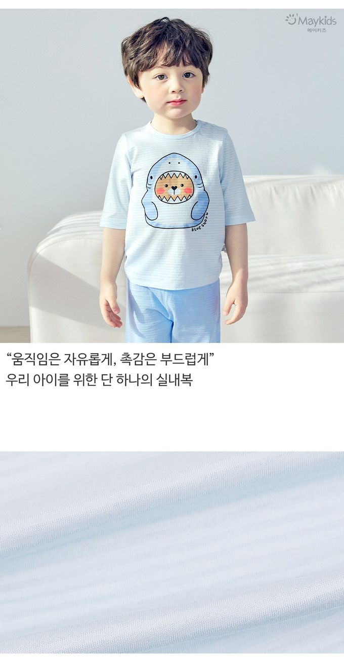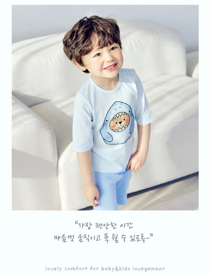 韓國 Maykids - 透氣條紋提花棉七分袖家居服-鯊魚熊熊-天藍