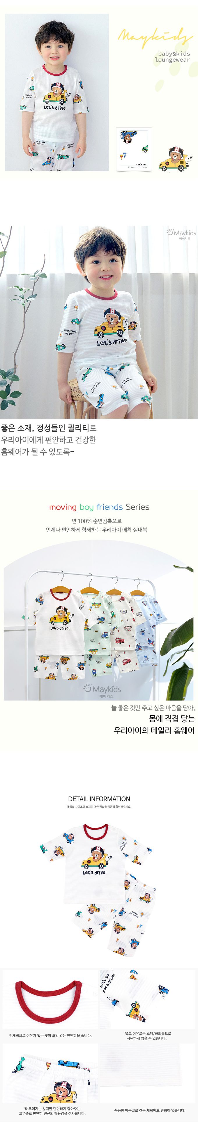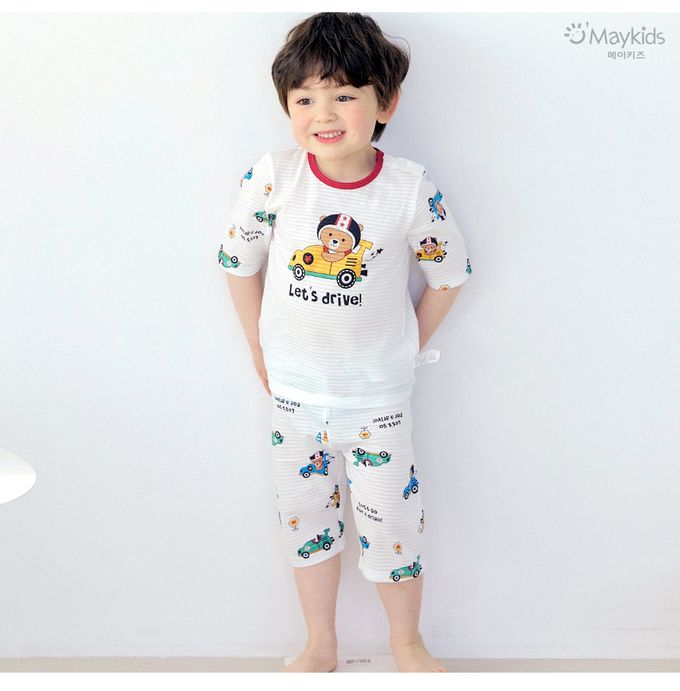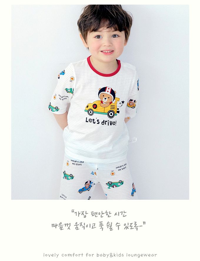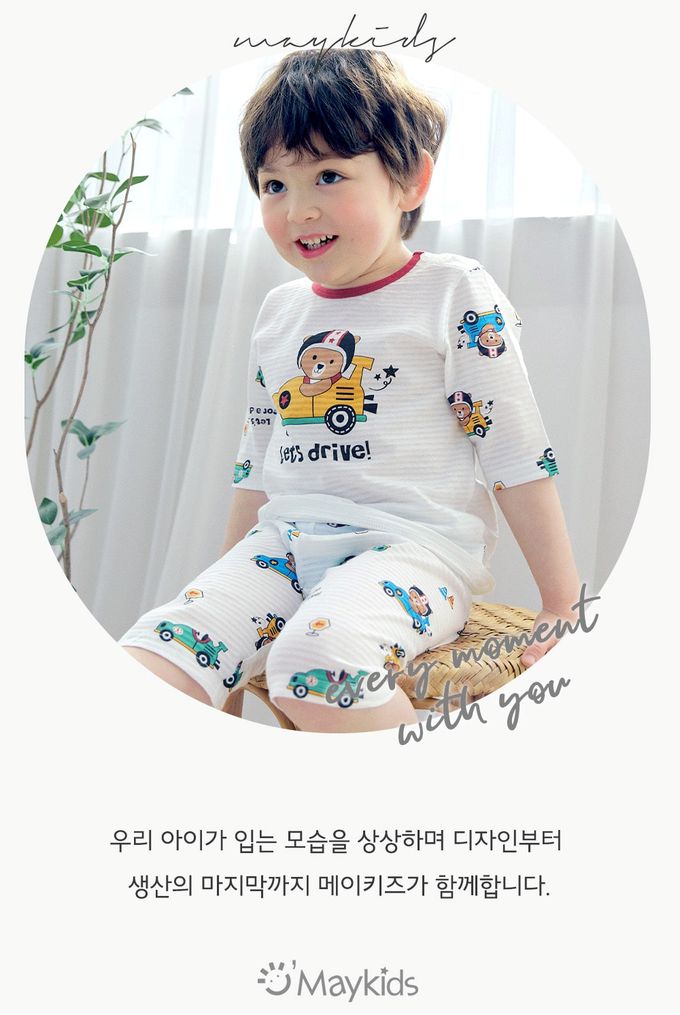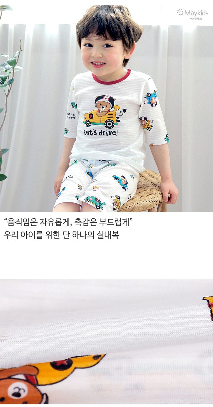 韓國 Maykids - 透氣條紋提花棉七分袖家居服-迷你工程車
