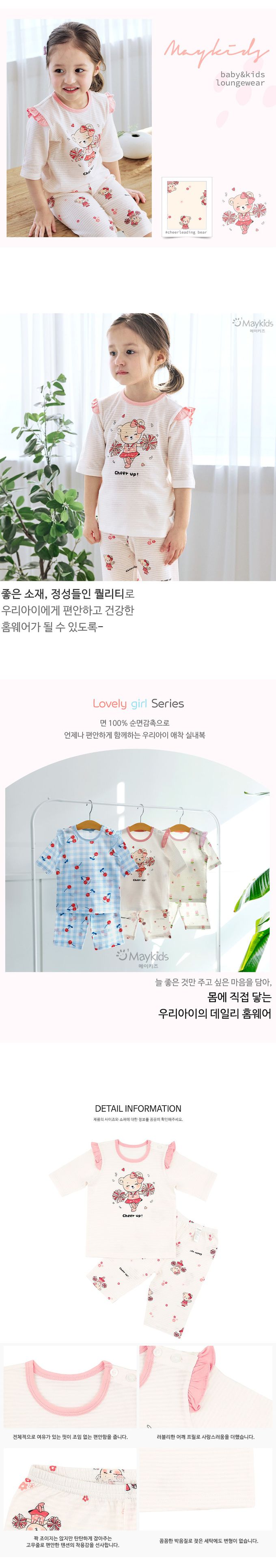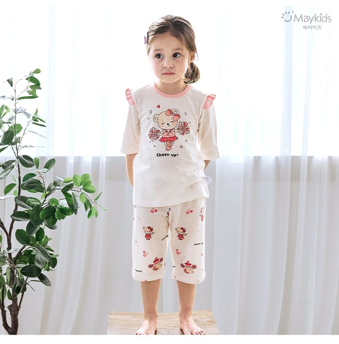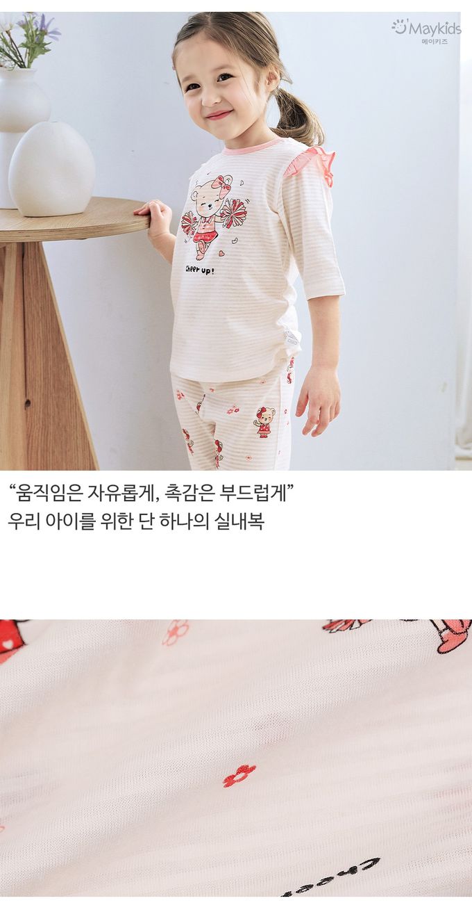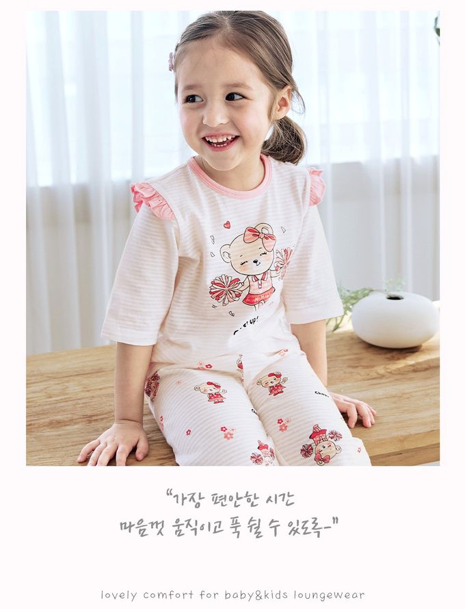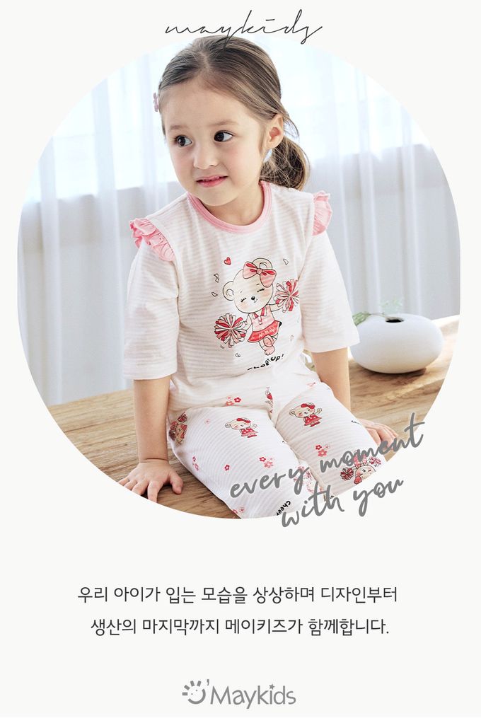 韓國 Maykids - 透氣條紋提花棉七分袖家居服-啦啦隊熊熊-米X粉