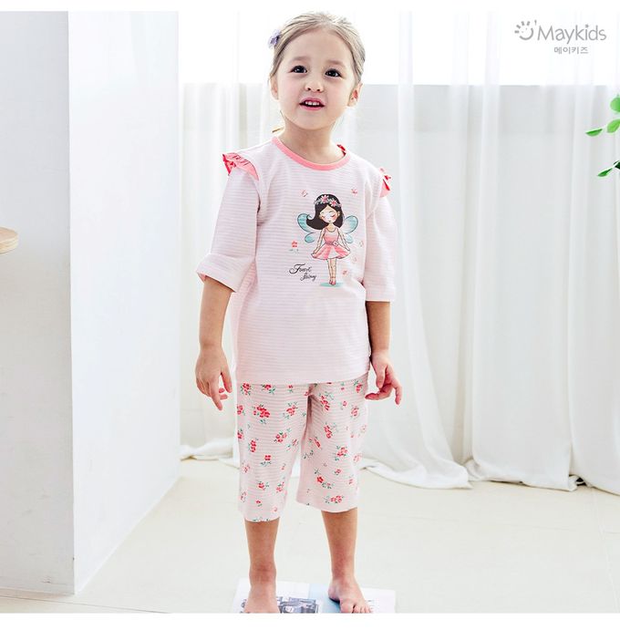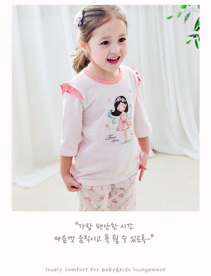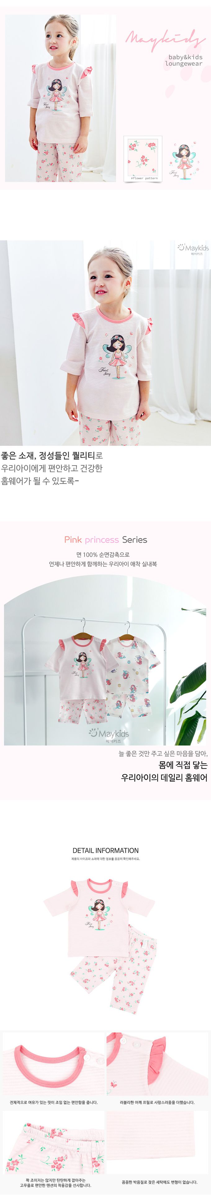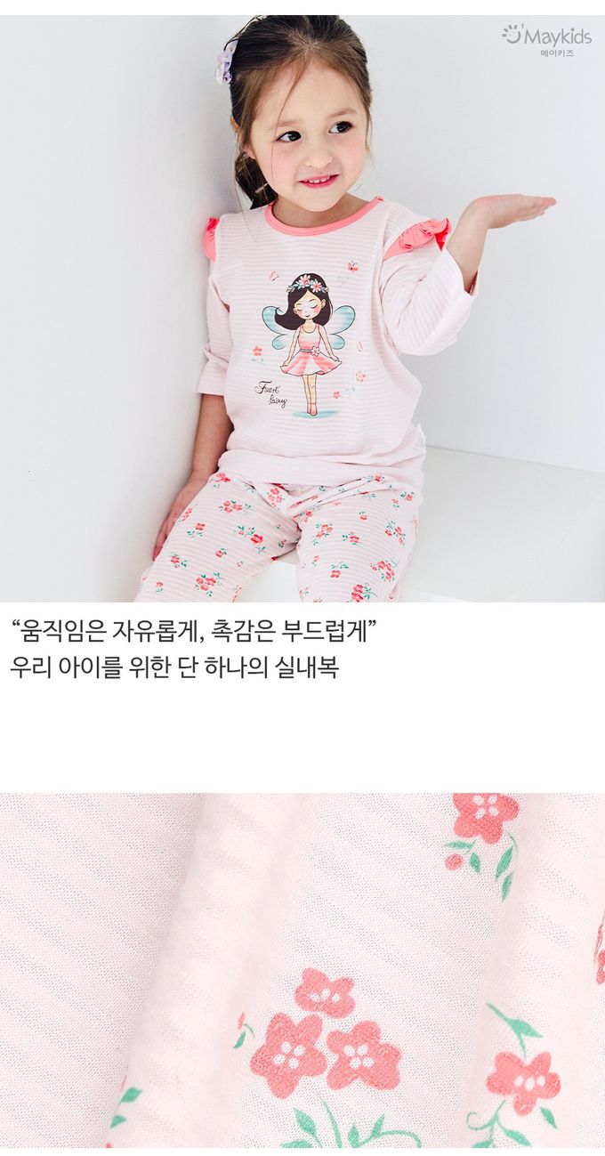 韓國 Maykids - 透氣條紋提花棉七分袖家居服-花朵精靈-粉