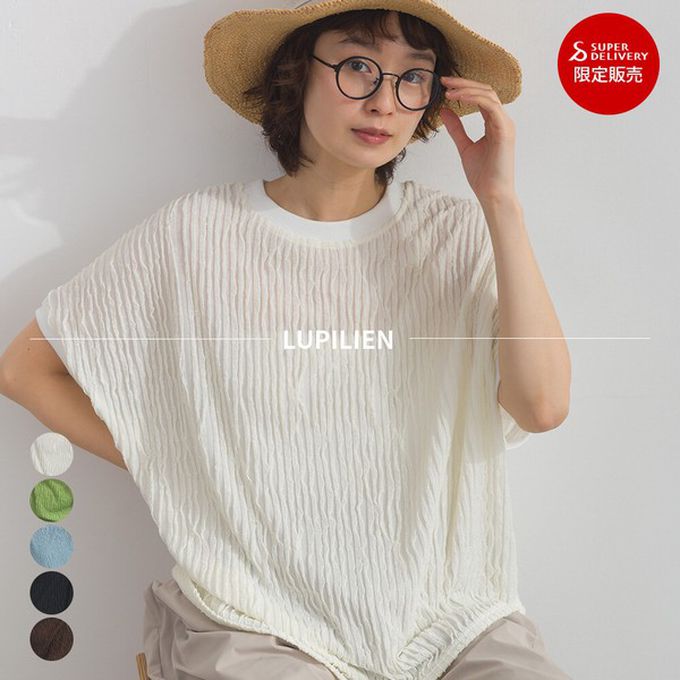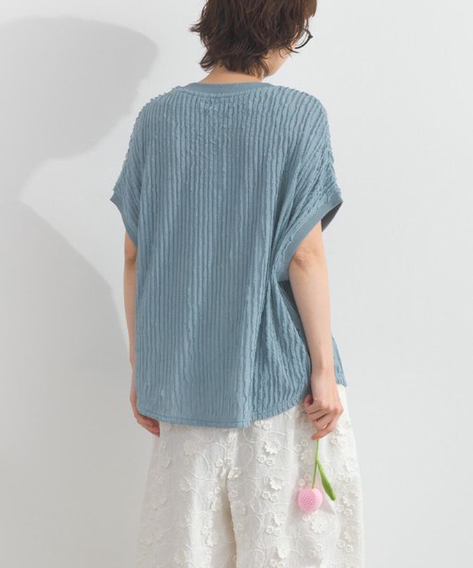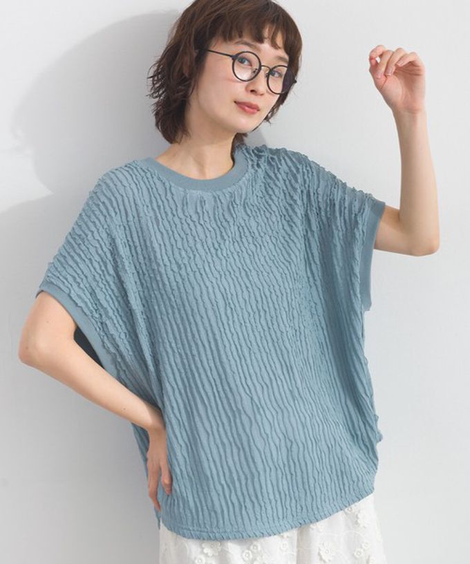 日本 Lupilien - 清新波浪紋理落肩寬版短袖上衣-藍