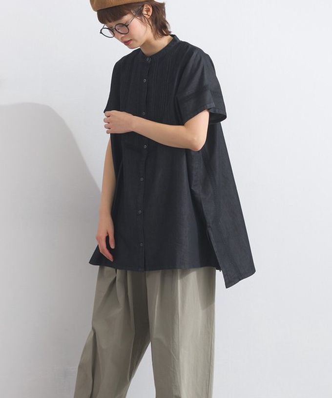 日本 Lupilien - 印度棉 輕盈丹寧布方領短袖襯衫-黑