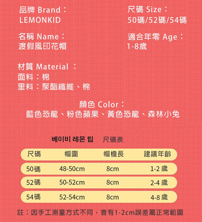 韓國lemonkid - 渡假風印花帽-粉色蘋果