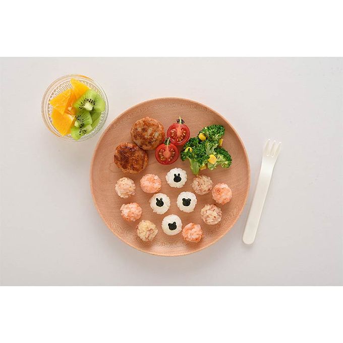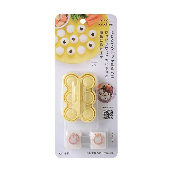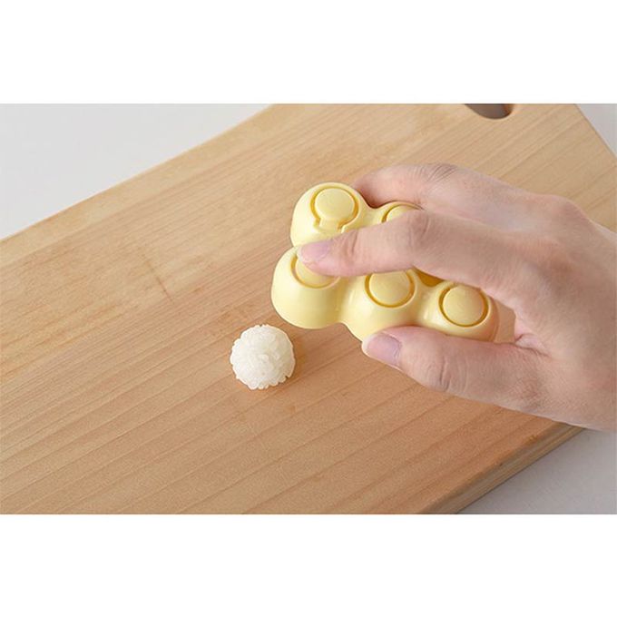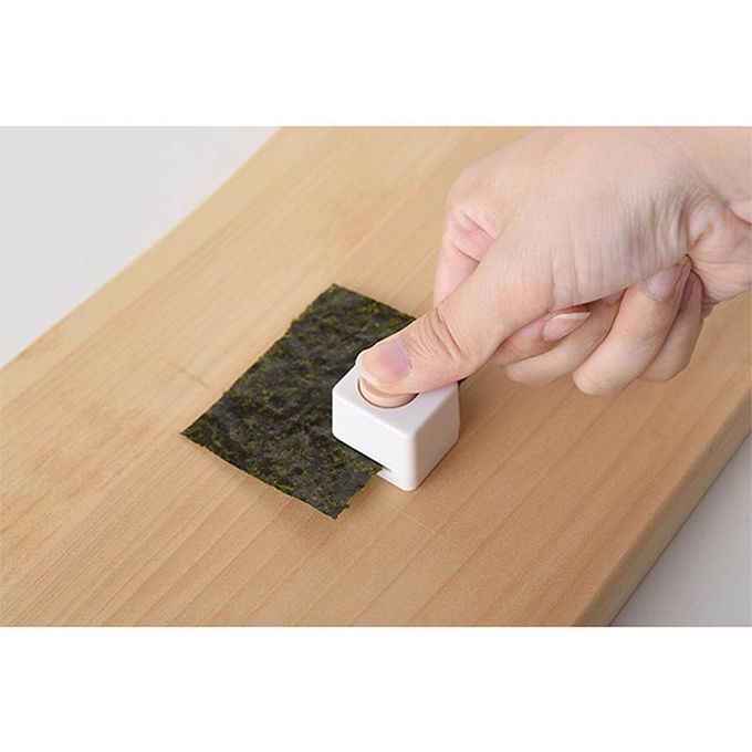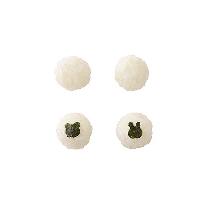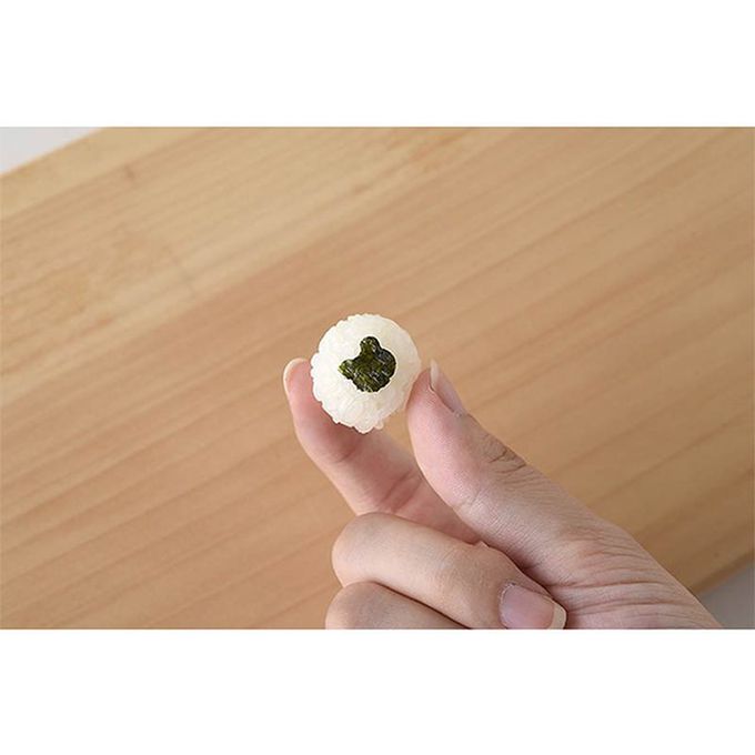 使用方式:①將飯糰模具稍微用水沾濕後,再放入白飯,確保沒有空隙。②用壓模將飯糰壓緊。③取下壓模,將模具倒置取出飯糰。※若按壓模具底部仍無法取出飯糰,請輕輕搖晃模具較容易取出。④用海苔打洞器壓出圖案。⑤將剪下的海苔裝飾在飯糰上即完成。<海苔切法>①將海苔放入海苔打洞器的插入口。②按下中間的按鈕,剪出圖案。※若海苔受潮可能無法完整地剪出圖案。