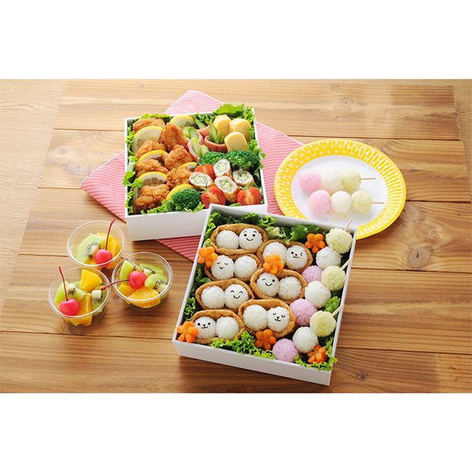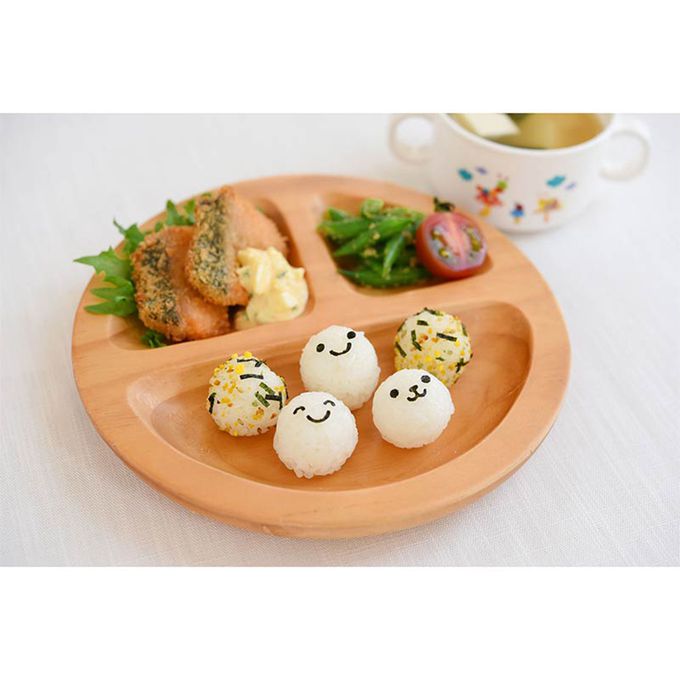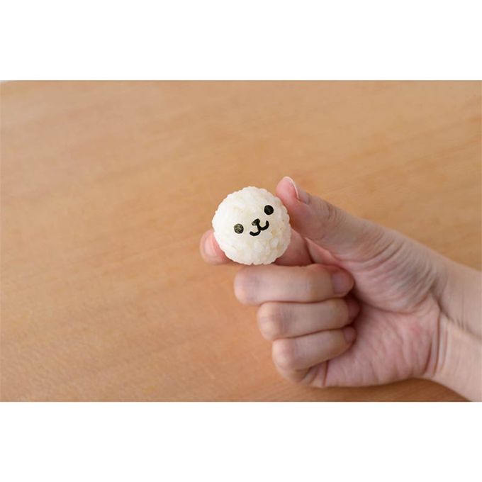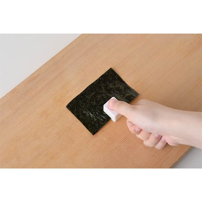 使用方式:①將飯糰模具稍微用水沾濕後,再放入白飯,確保沒有空隙。②蓋上壓模,左右搖動約5次。③取下壓模,將模具倒置取出飯糰。④將海苔放入海苔打洞器的插入口,按下中間的按鈕,剪出圖案。※若海苔受潮可能無法完整地剪出圖案。⑤將剪下的海苔裝飾在飯糰上即完成。