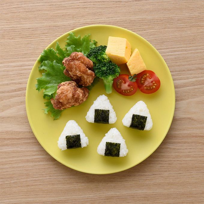 使用方式:①將飯糰模具稍微用水沾濕後,再放入白飯,確保沒有空隙。②用壓模將飯糰壓緊。③取下壓模,將模具倒置取出飯糰。※若按壓模具底部仍無法取出飯糰,請輕輕搖晃模具較容易取出。④將海苔與海苔切割器放在切割墊上,用手按壓,將圖案切出。※若海苔受潮可能無法完整地切出圖案。⑤將切下的海苔包在飯糰上即完成。