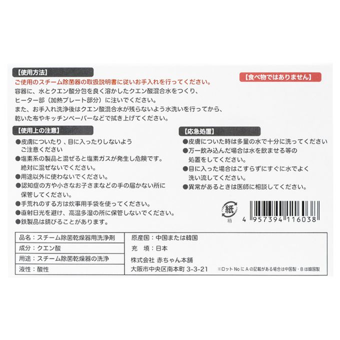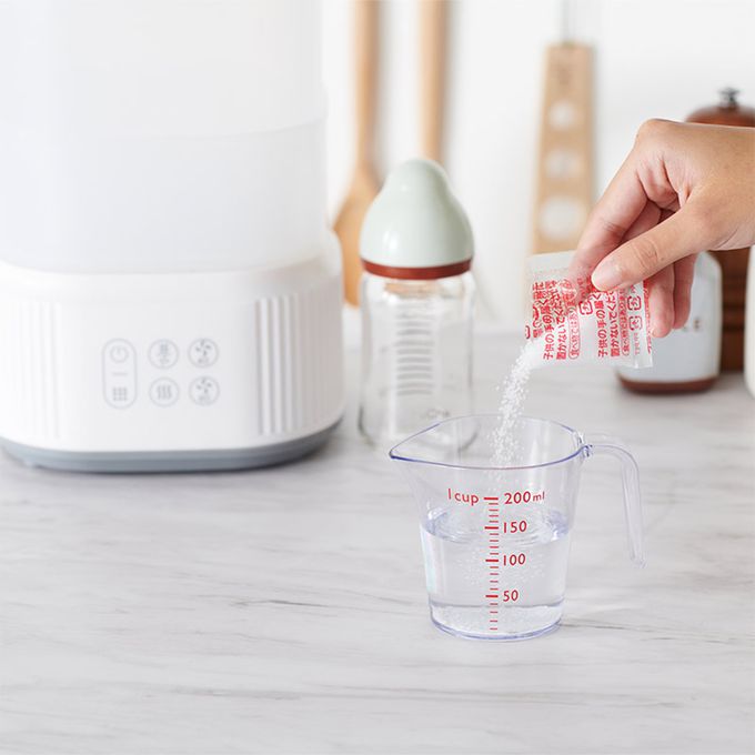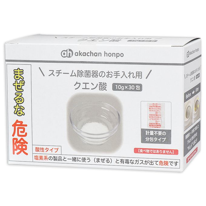 使用方式:●請依照所使用之奶瓶消毒鍋之使用說明清潔。●請於容器中加入水與檸檬酸,充分混和溶解後,倒入奶瓶消毒鍋的加熱盤。●清潔完畢後,請以清水沖洗,確保加熱盤上無殘留檸檬酸,並以乾布或廚房紙巾擦拭乾淨。●保存時請避開陽光直射、高溫潮濕之處。