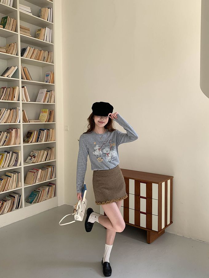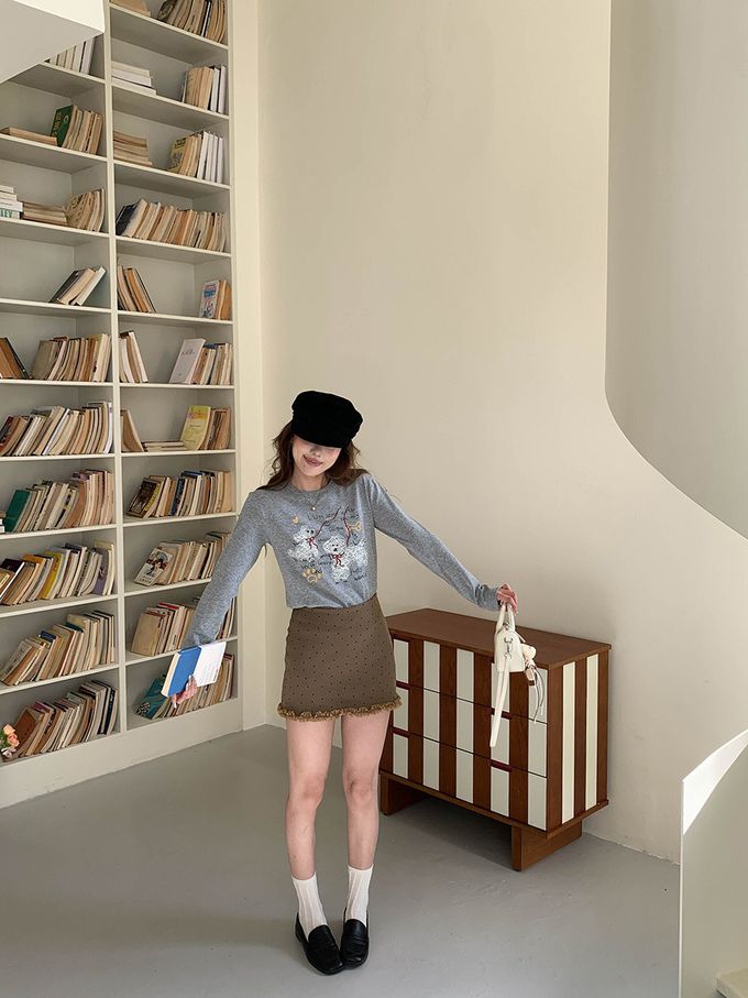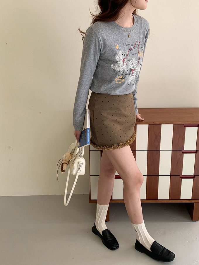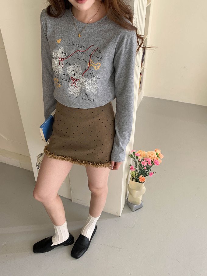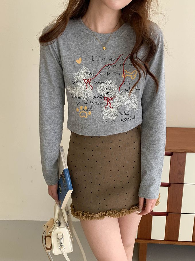 3th Morning - 手繪捲毛狗狗插畫長袖上衣-灰 (F)