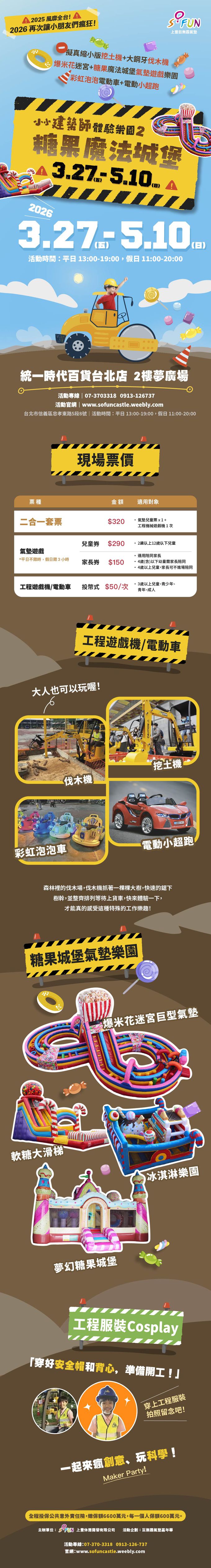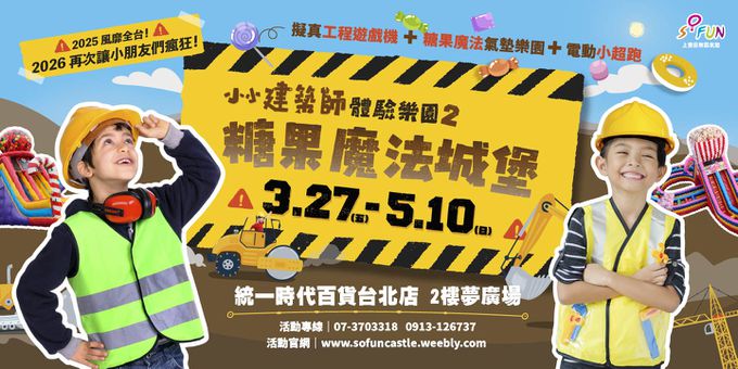 建築師體驗樂園2昇級版,好玩又樂趣,不怕你玩到人來瘋!超擬真縮小版挖土機、伐木機、大鋼牙抓物機、伸縮臂吊車,仿真外觀和操作功能,讓小朋友秒變建築大師,爸媽也忍不住體驗建築達人的樂趣。現場還有四座巨型氣墊樂園:軟糖大滑梯、爆米花迷宮、冰淇淋樂園和夢幻糖果城堡。新增加投幣設備超夢幻彩虹泡泡射和電動超跑,讓孩子FUN電爆汗開心瘋玩都不累!