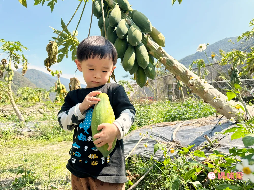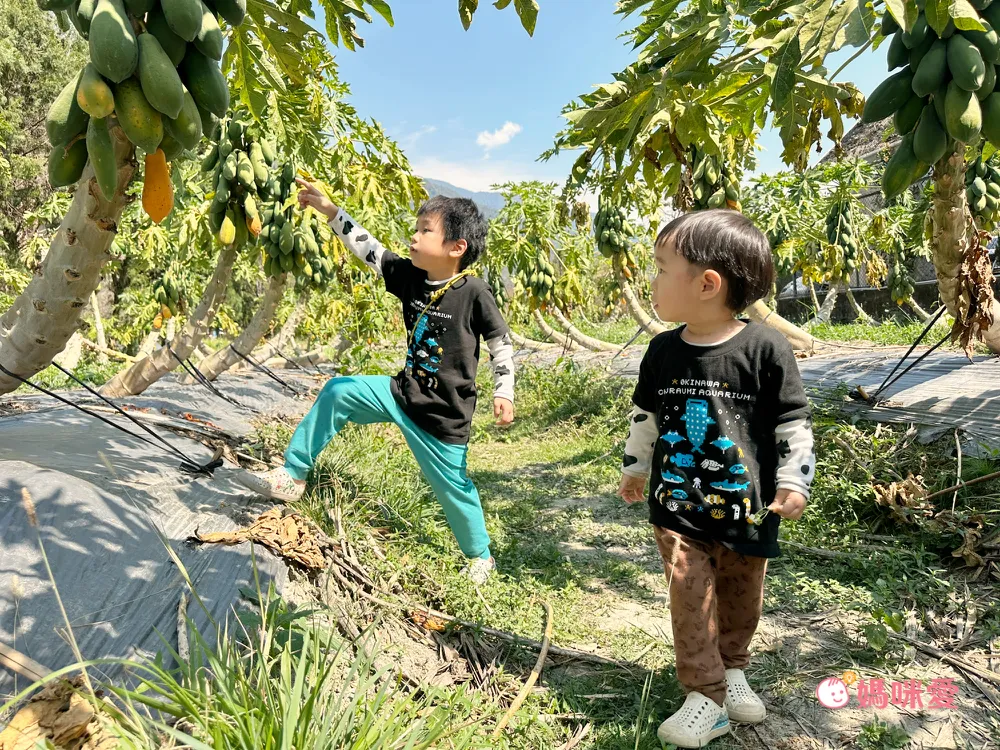 霂、晳看完採木瓜教學之後,就進入木瓜園裡探險了,首先太綠的木瓜不能選,太黃的木瓜又太熟了,要綠色又帶一點黃的木瓜才是最好的,過程中可以訓練孩子們的觀察力。選好木瓜之後擺好架式,將木瓜稍微往上扳再向下,喀地一聲,木瓜就採下來囉!