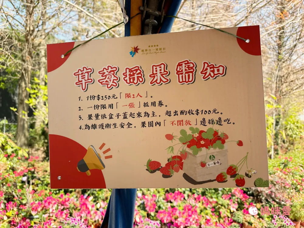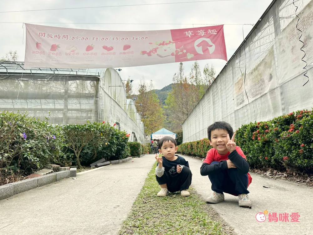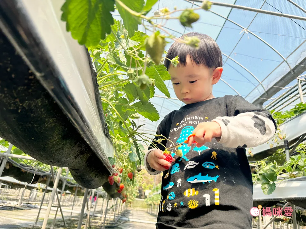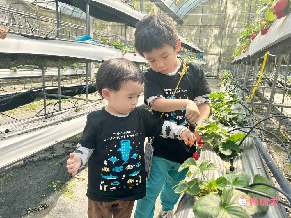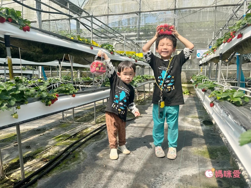 另外我們也自費採草莓(住客打折,依現場規定為準),可以直接再花泉會館櫃台購入草莓採果卷,一張券可到草莓園換採果盒(一張限定兩人使用),可以採到裝滿草莓為止。草莓園內草莓的品種非常多種,可以選喜歡的甜度及口感,霂、晳逡巡在草莓園中尋找最好吃的草莓,非常樂不可支。