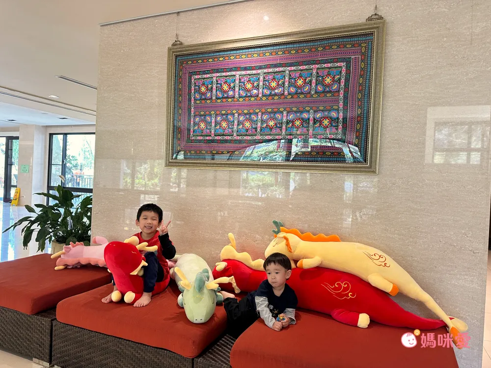 進到【楓樺台一渡假村】園區步行賞花約2分鐘,就會看到我們晚上要住宿的「花泉卉館」(與本賣場民宿「花卉驛棧」專案不同,本開箱僅供參考園內設施活動),顧名思義就是可以賞花又泡溫泉的休憩地,大廳寬敞明亮且舒適,由於今年是龍年的關係,大廳內到處都有可愛的龍龍大抱枕,讓孩子在等待時間也可以玩耍。