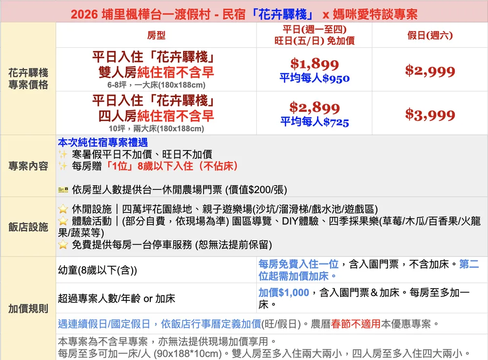 註:🎁 依實際入住人數贈送台一休閒農場門票(價值$200/張)、依房型人數(即雙人房兩份、四人房四份) 、每房贈送一位8歲以下兒童入住不佔床。